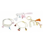 2 klambrit, 1 nööpnõel, 2 tupsu, 1 hõbedane tupsu, 1 pitslint, 1 täpiline lint, roosa puuvillane niit, 10 amuletti, 1 hõbedane rant, 2 kokkusurutavat otsaklambrit, 14 rõngast, 1 värviliste illustratsioonidega juhend.