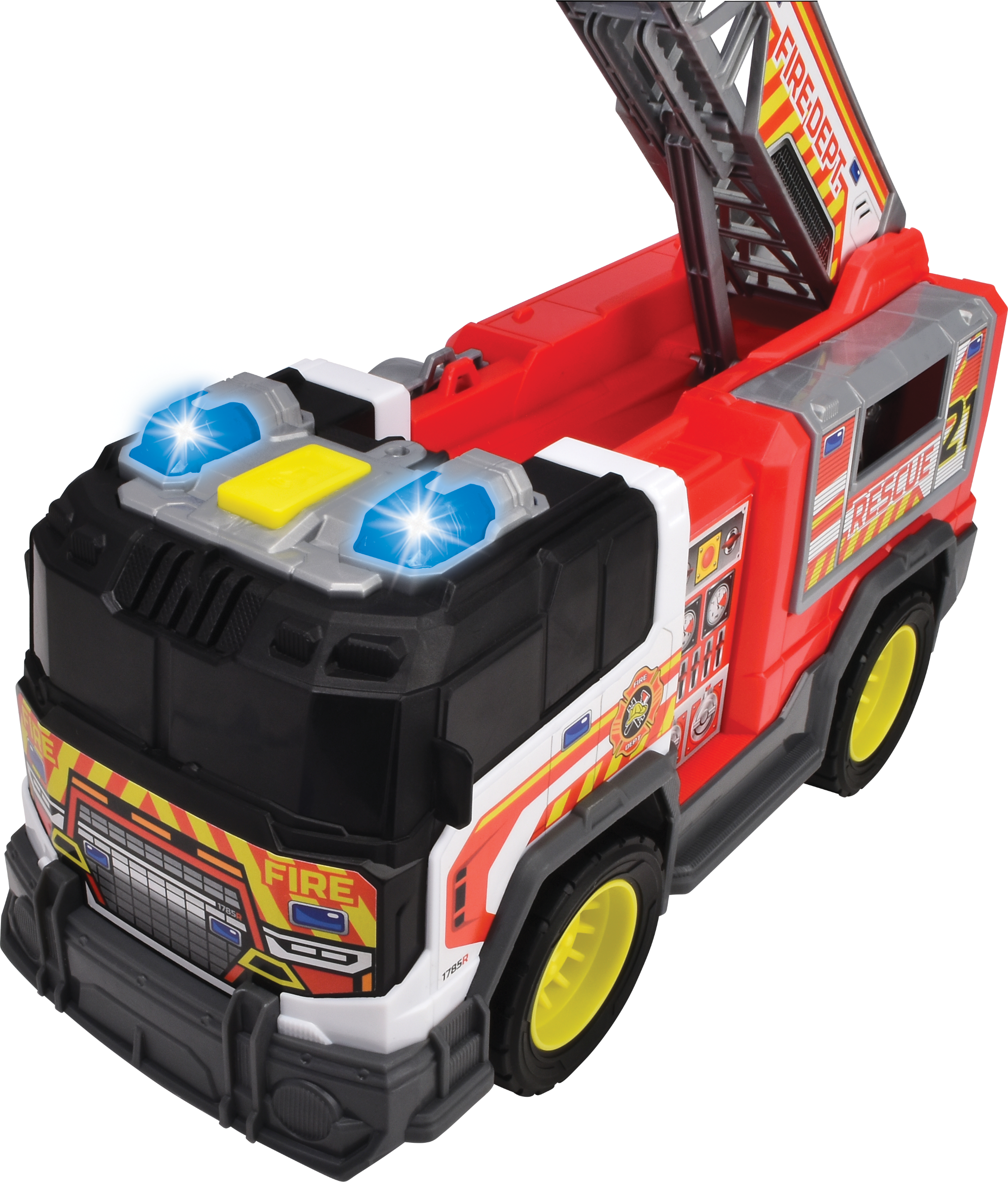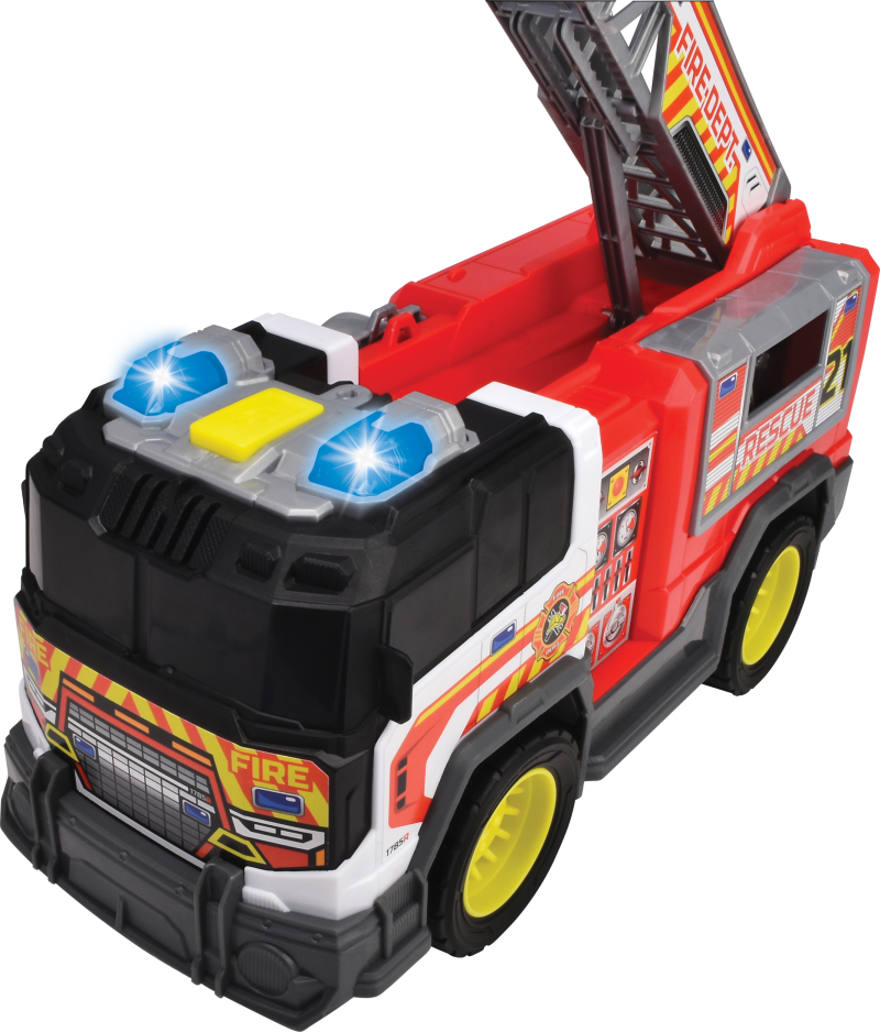 Dickie Toys tuletõrjeüksus (30 cm) – suur tuletõrjeauto redeli, valguse ja heliefektidega, mis on mõeldud lastele alates 3. eluaastast. Tuletõrjeautoga tulevad kaasa ka patareid.