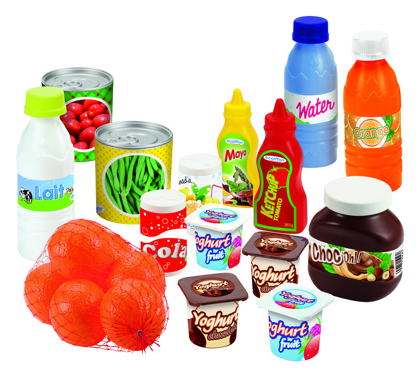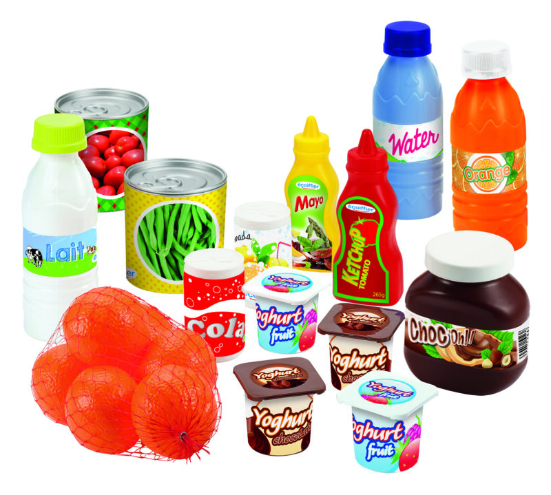 Veepudel, apelsinimahl, šokolaadimääre, piim, ketšup, majonees, kaks kasti roheliste ubadega, tomatid, neli Jogurtit, kaks karastusjooki ja võrk 6 apelsiniga. Ideaalne ka lisandiks mängukööki või toidupoe varustusena. Valmistatud Prantsusmaal. Mõõdud (P x L x K): 22,3 x 21,5 x 19 cm