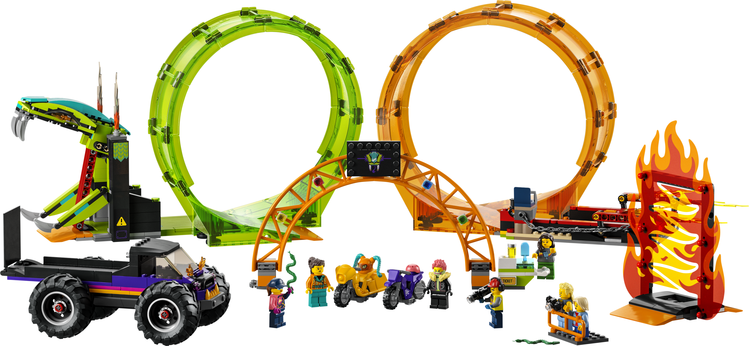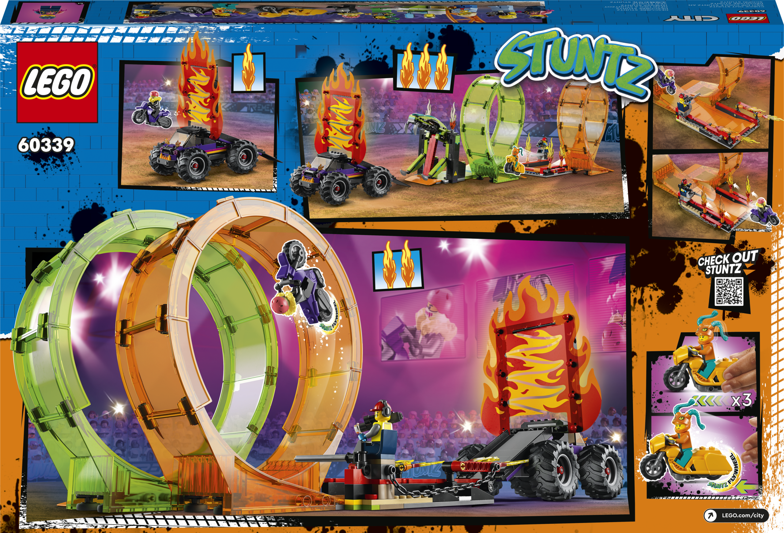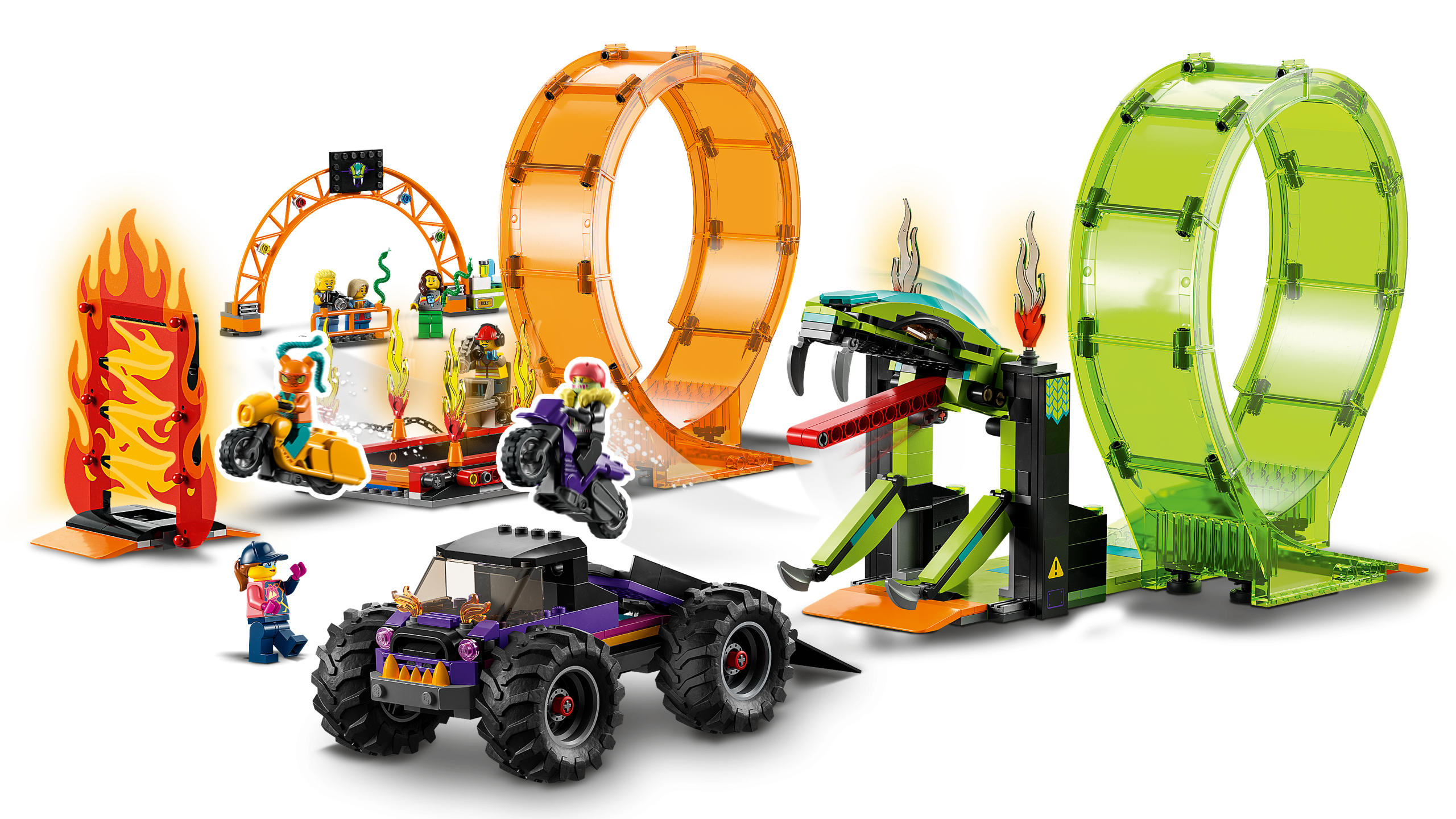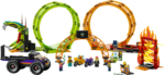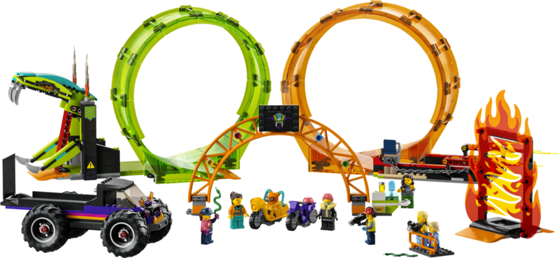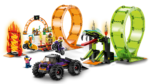 LEGO City kahe silmusega trikiareeni (60339) mängukomplekt sisaldab palju põnevaid detaile, kaht hooratta jõul liikuvat trikimootorratast ja hiigelveokit .