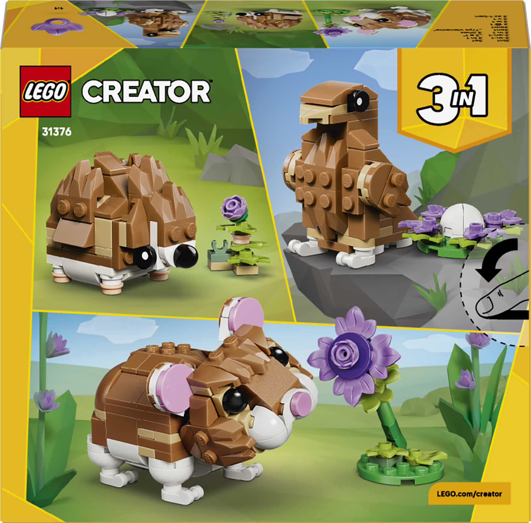 Kolm ühes loomamänguasi – LEGO® Creator kolm ühes armas hamster lillega (31376) ehitusmänguasi võimaldab alates 7-aastastel tüdrukutel ja poistel ehitada ja ümber ehitada 3 armsat mänguasja samade klotsidega