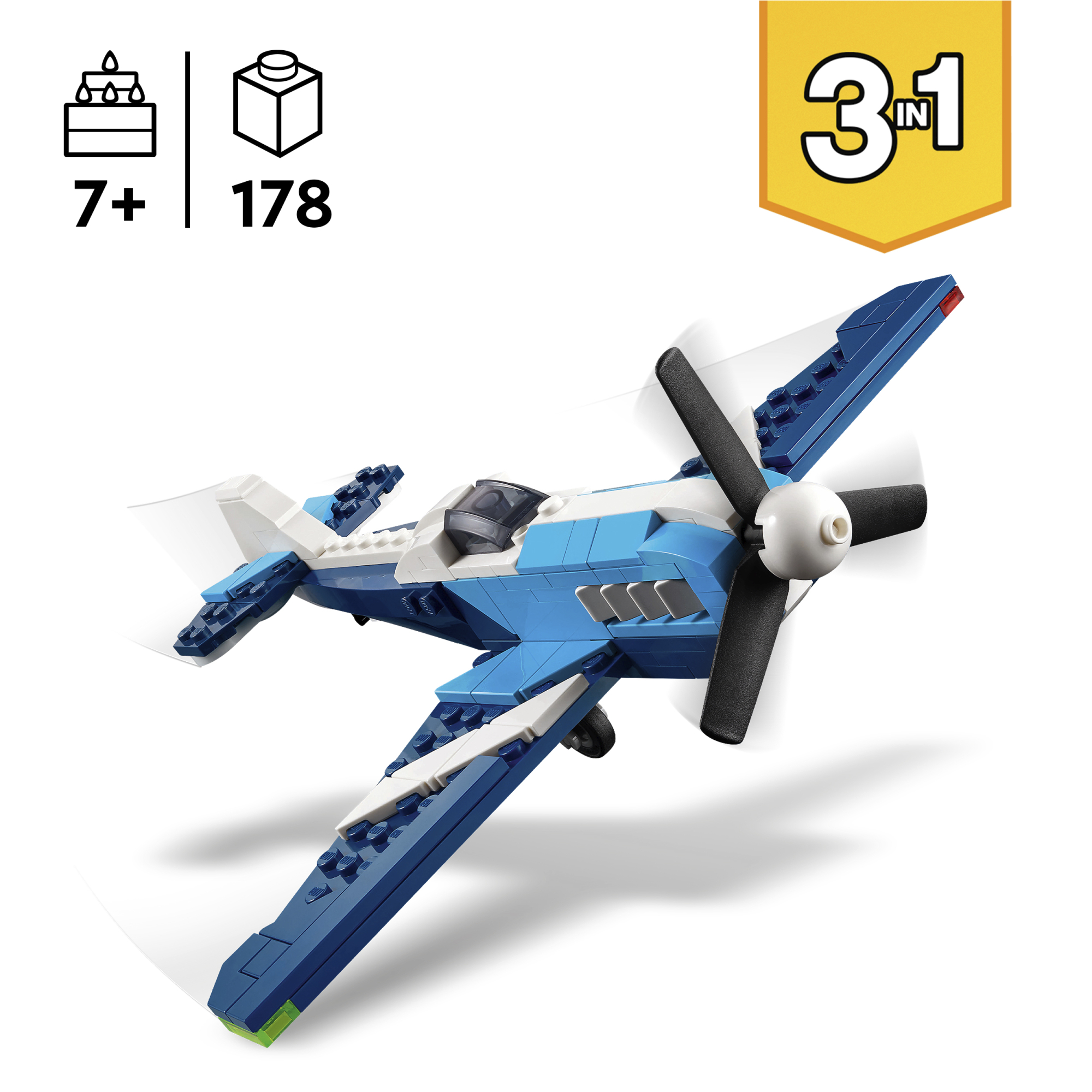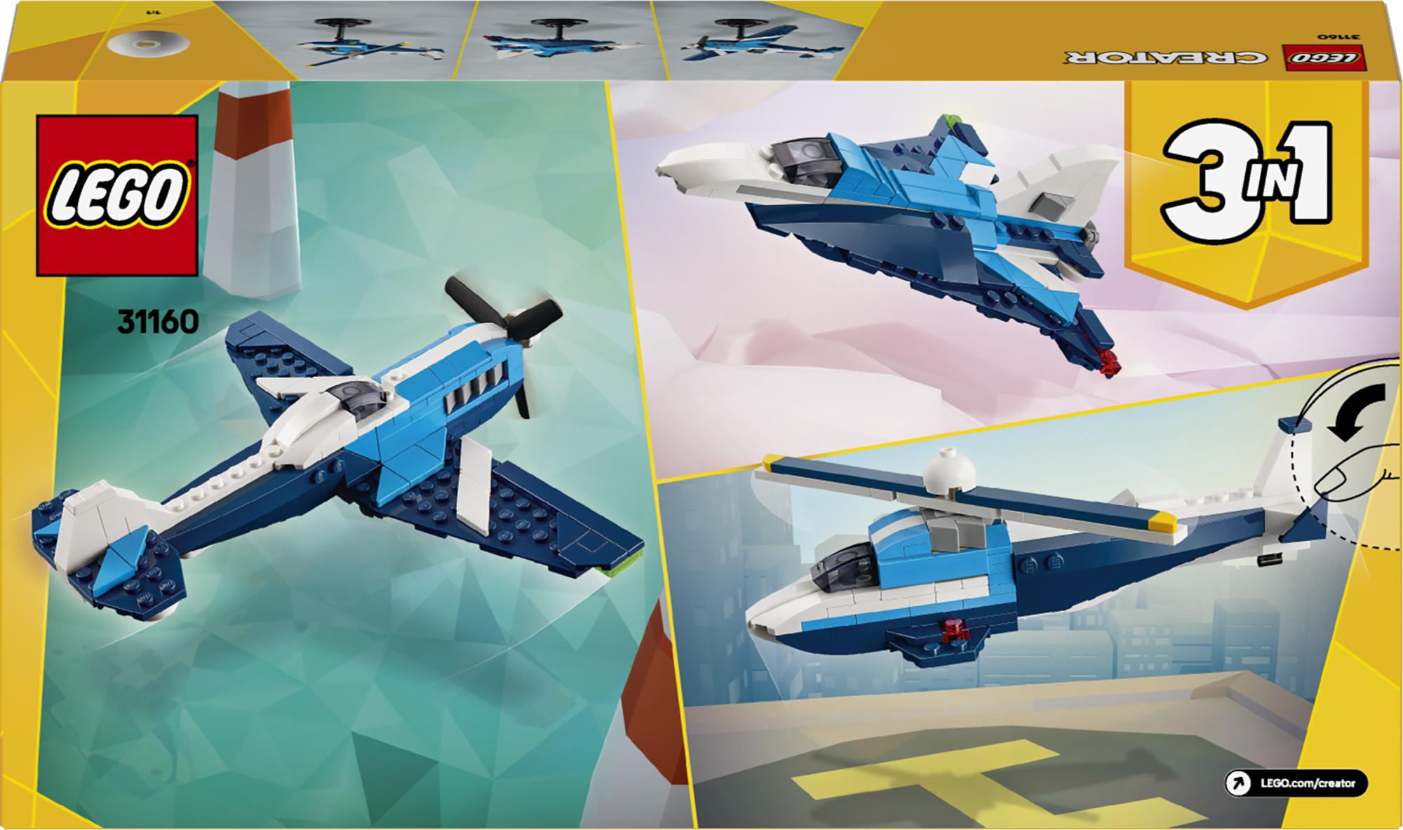 • 3 laste mängusõidukit ühes karbis – komplekt LEGO® Creator Lennukid: võidusõidulennuk võimaldab alates 7-aastastel poistel ja tüdrukutel ehitada ja ümber ehitada 3 erinevat sõidukit samade klotsidega