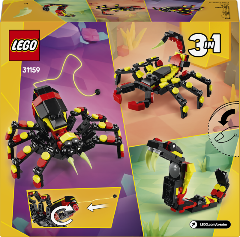• Ämblikuga LEGO® komplekt mängimiseks ja väljapanekuks – loomafiguure saab pärast mänguaega esitlemiseks välja panna ja lapsed saavad ämblikmänguasja seljast välja tõmmata neoonkollase võrgu, et see LEGO klotsi küljest alla rippuma panna