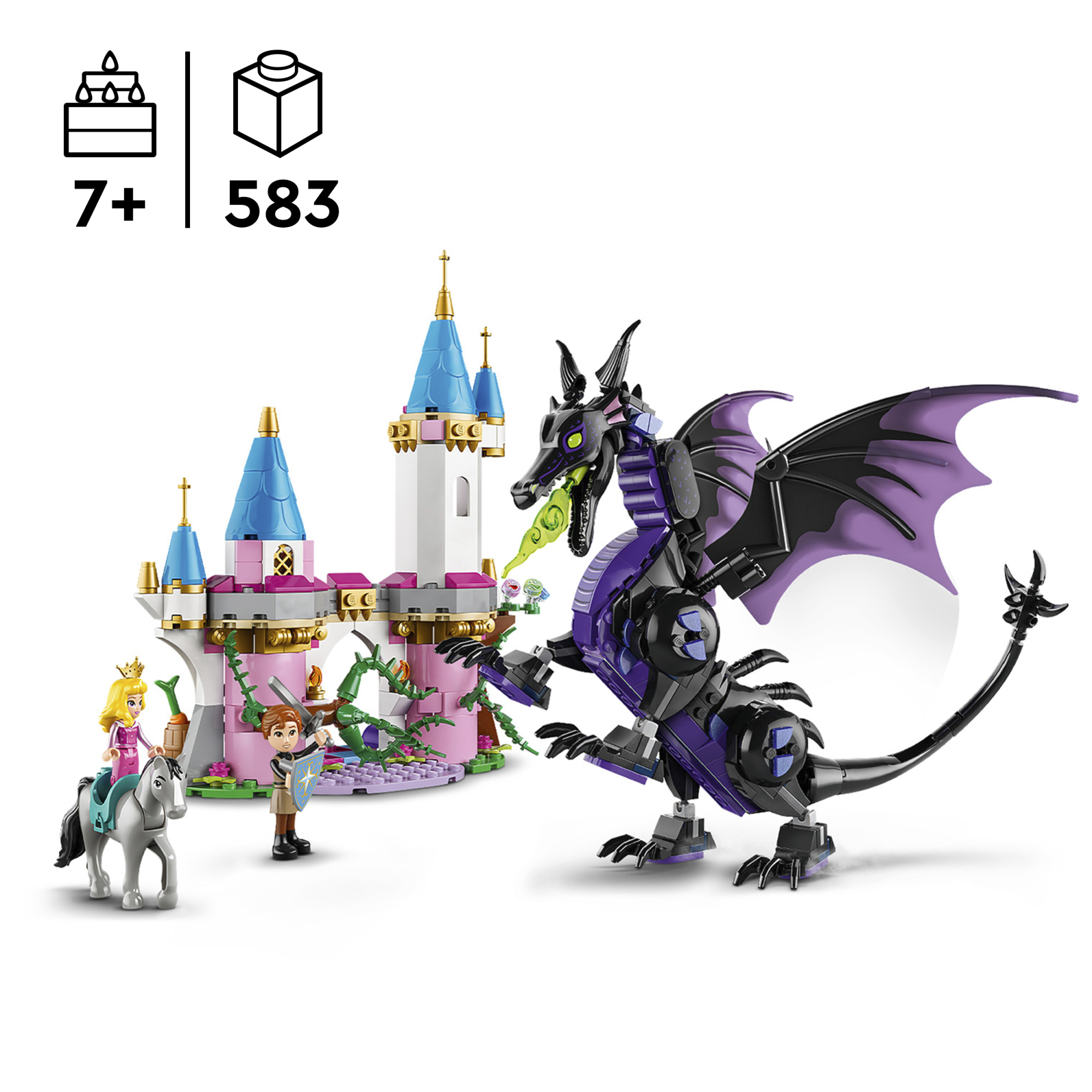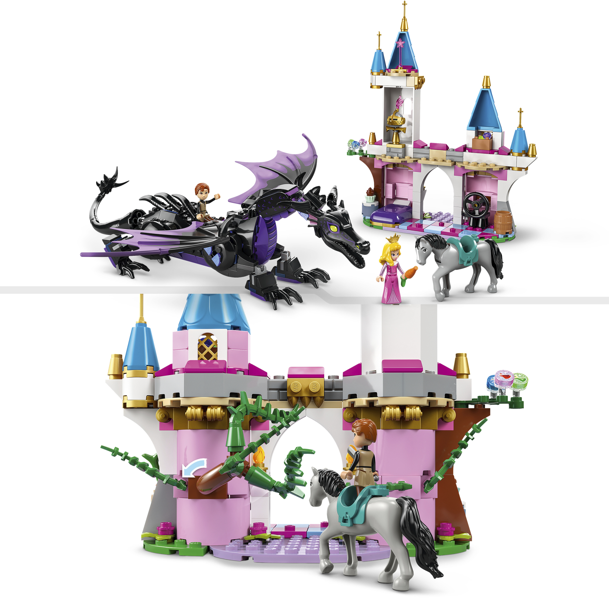 • Muudetava asendiga mudel – kokkupandavate tiibadega muudetava asendiga draakoniehitusmänguasi sild ja torniosa, Aurora ja Prints Phillipi LEGO® ǀ Disney mininukufiguurid ning LEGO ǀ Disney hobusefiguur
