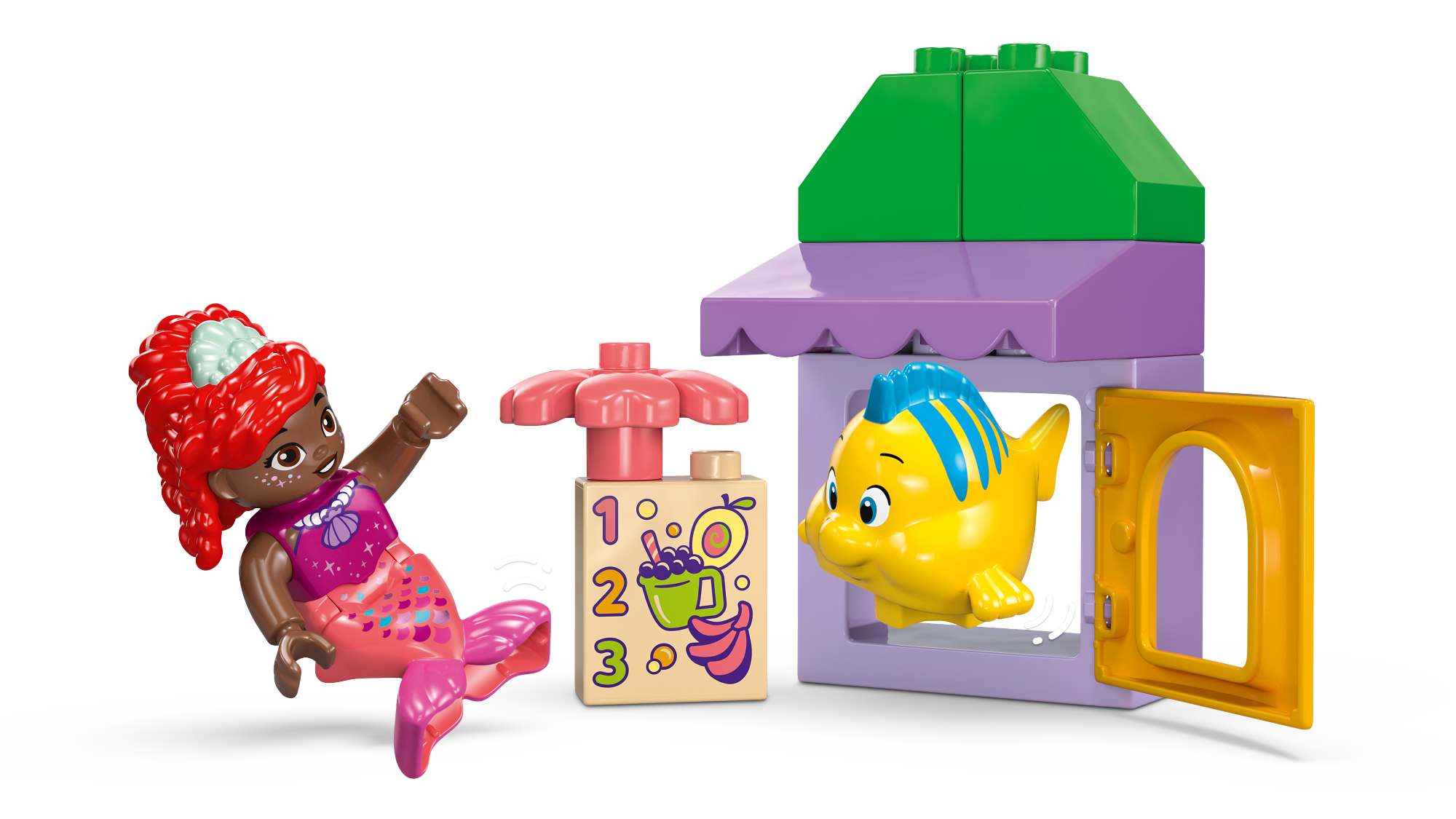 • Kaks tuttavat tegelaskuju – see rollimängu ehitusmänguasi eelkooliealistele lastele sisaldab kahte LEGO® DUPLO® figuuri: Ariel ja Flounder Disney Juniori telesarjast Ariel