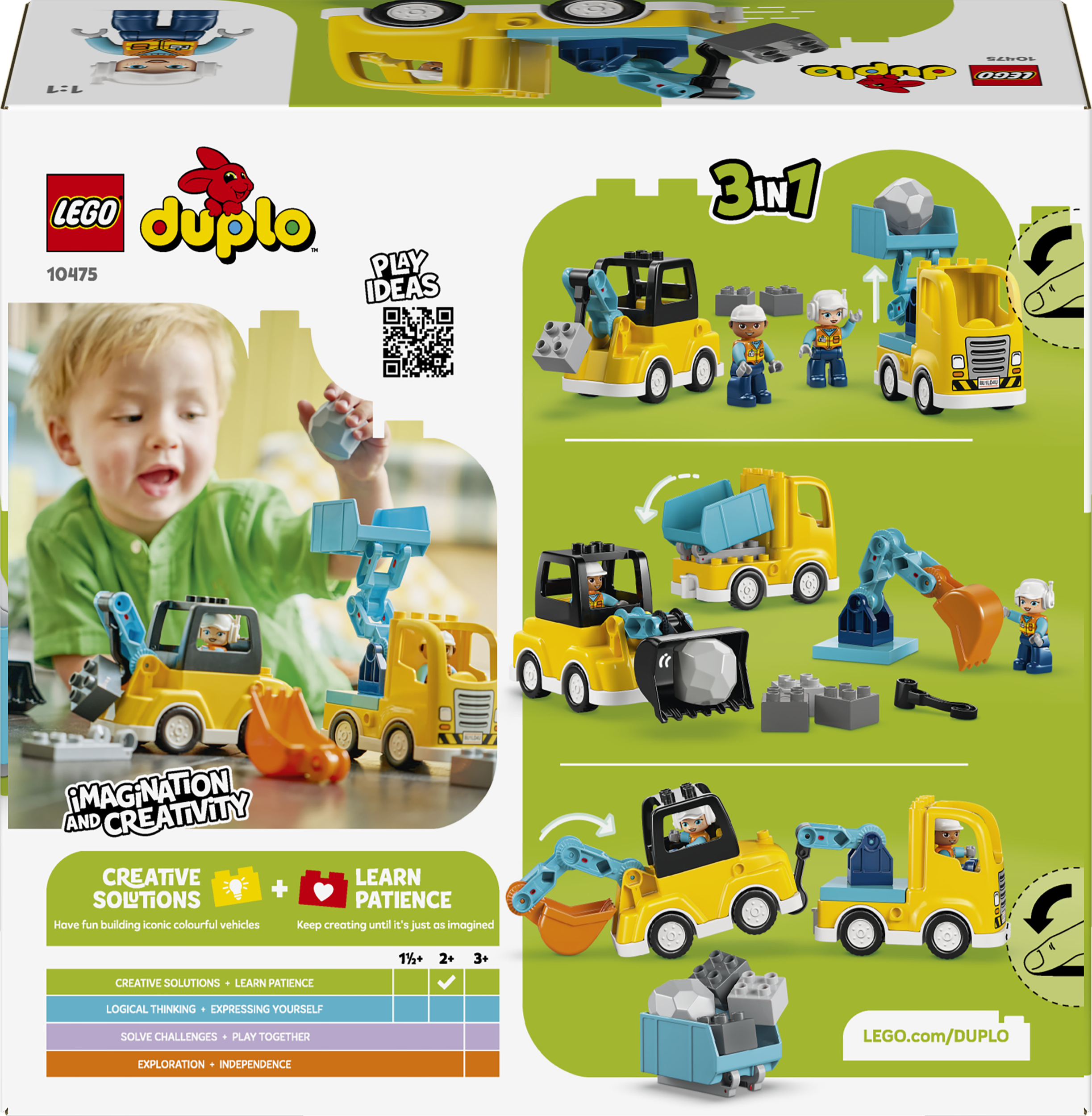 MÄNGUASJAD VÄIKELASTELE – Erguta väikelaste loovust LEGO® DUPLO® linna Kolm ühes ehitusmasinate (10475) komplektiga, mille 22 klotsi abil saab kokku panna 6 veoautomänguasja