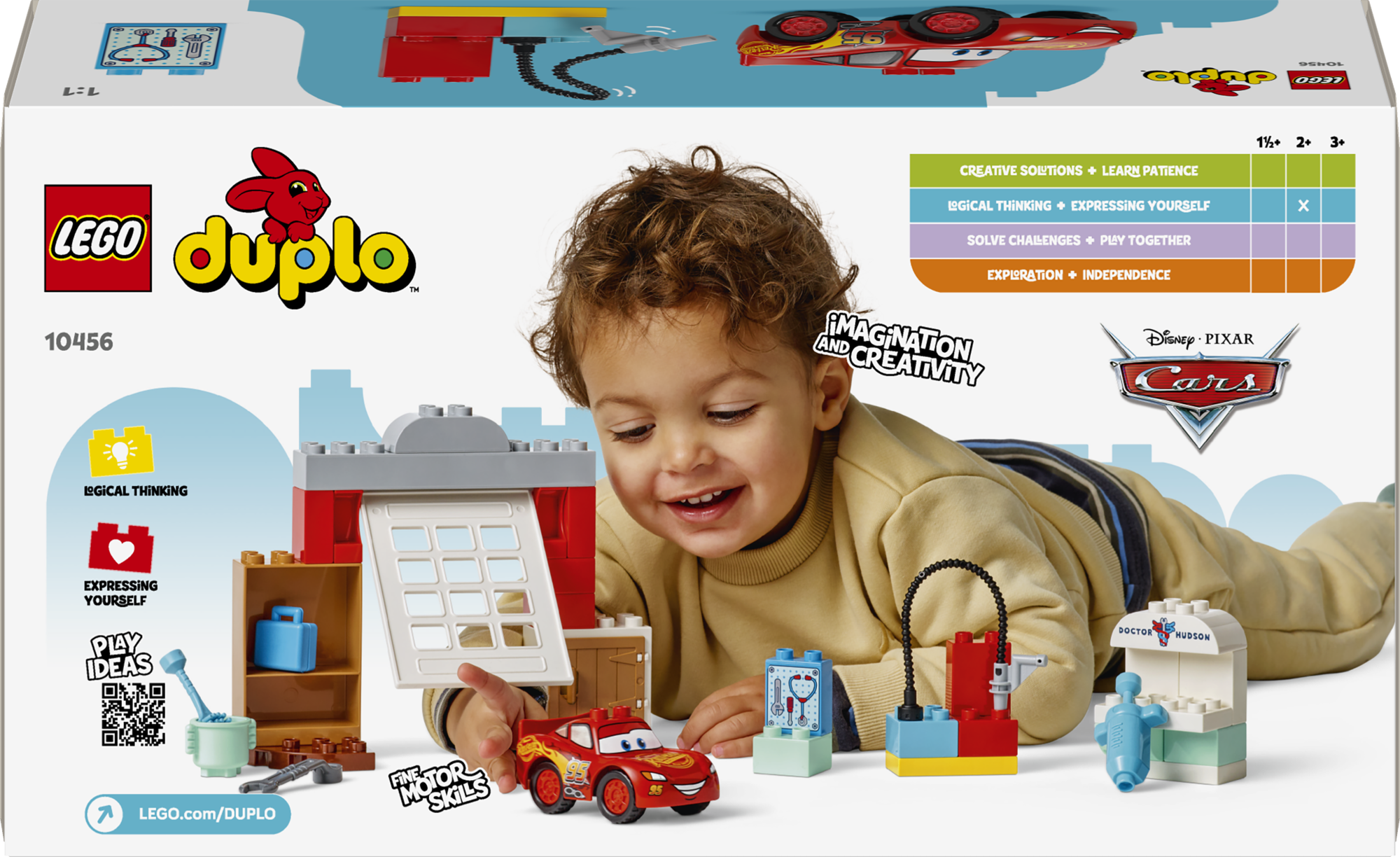 Lase koolieelikutel hoolitseda oma lemmiku kokkupandava võidusõiduauto eest komplektiga LEGO® DUPLO® │ Disney ja Pixari autod McQueeni külaskäik Doci garaaži (10456).