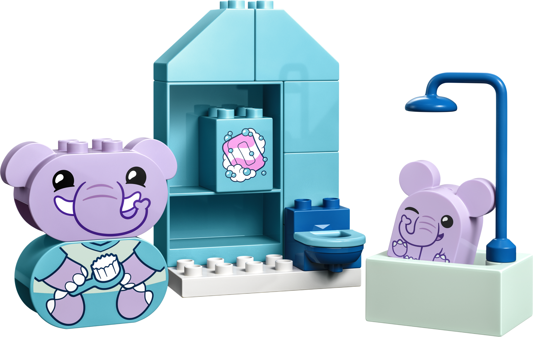 • Väikelapse õppemänguasi – kaasas on kaks elevandimänguasja, lisaks tualett, vann ja dušš, mis on ehitatud vastupidavatest LEGO® DUPLO® klotsidest ning elementidest, et harjutada pesemisrutiine lõbusal viisil