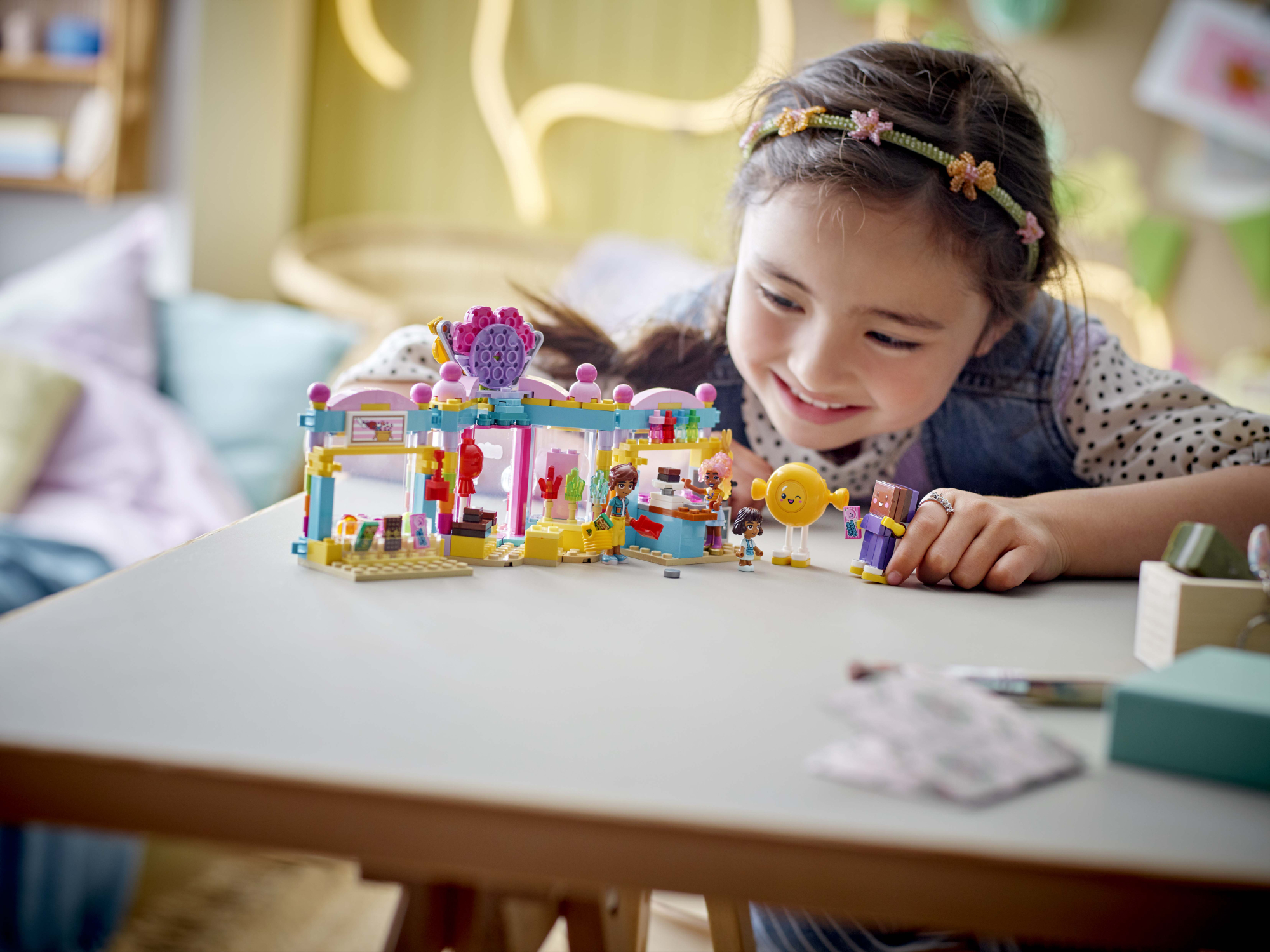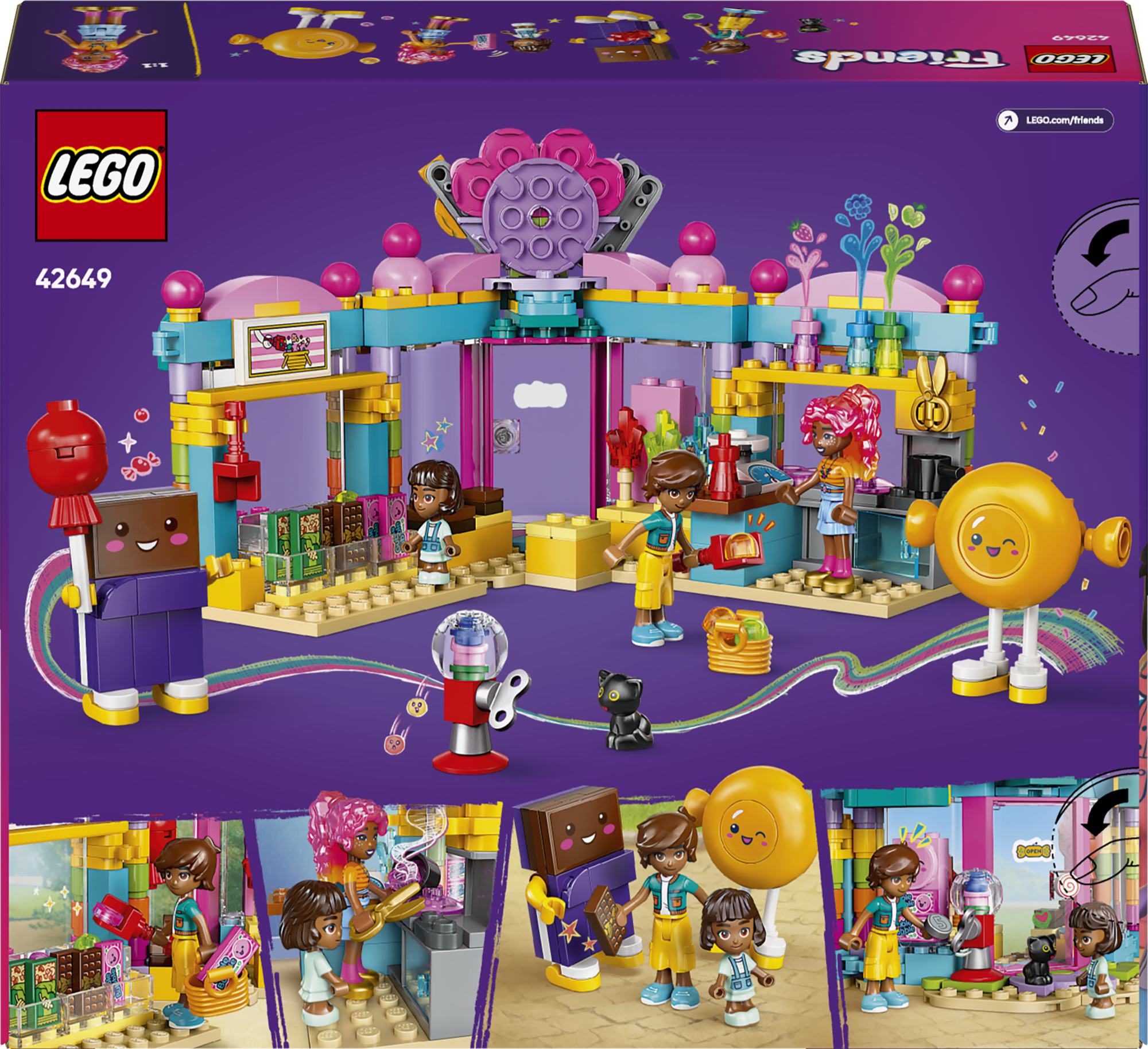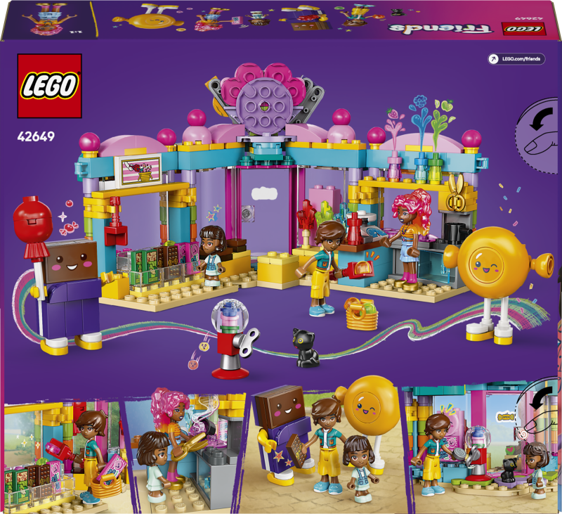 • Lõbus – komplektis on palju kommipoe funktsioone, nagu kommivalik, hiiglaslik pulgakomm, kommiautomaat ja kommide valmistamise ala koostisosade, kääride ja keedupotiga