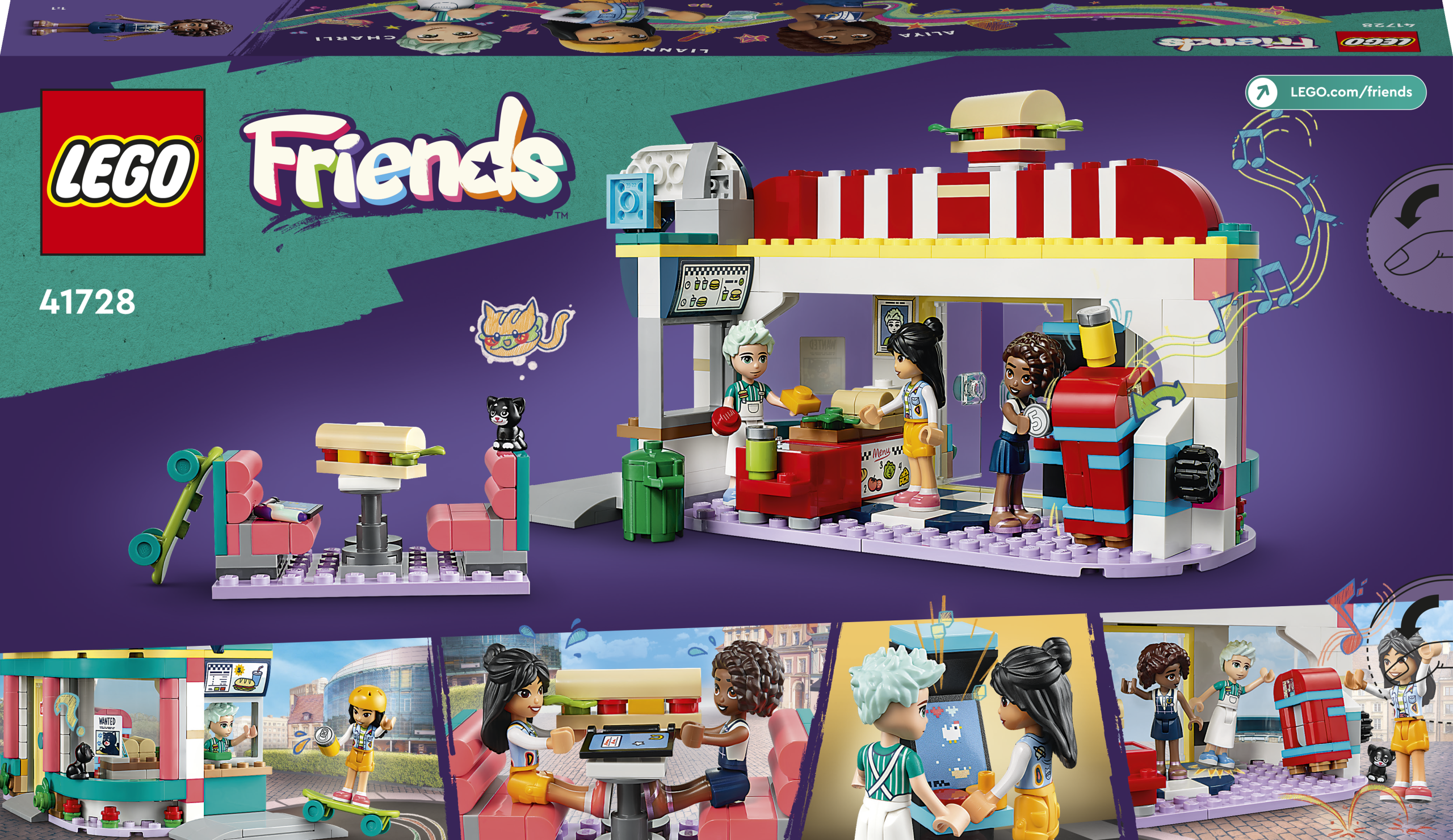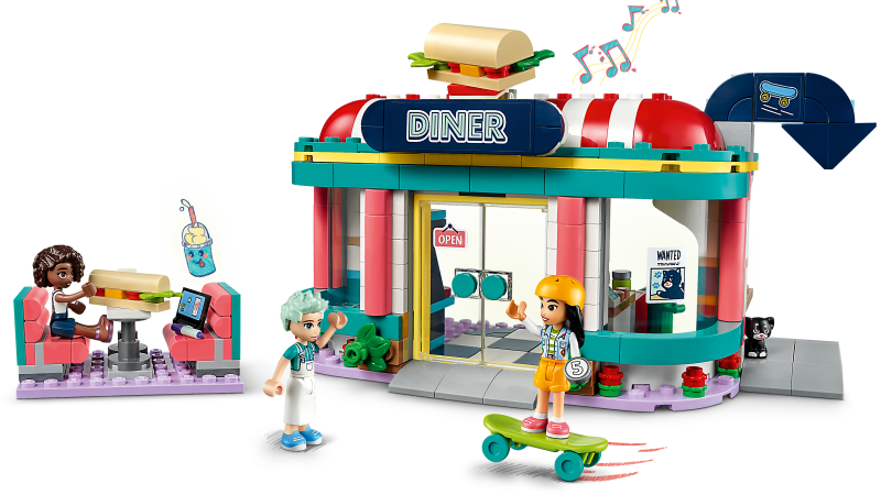 • Restoraniteemaline rollimäng alates 6-aastastele lastele – see LEGO® Friends Heartlake’i kesklinna kiirsöögirestorani (41728) komplekt inspireerib lapsi tundide kaupa rollimänge mängima