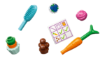 MÄNGUTARVIKUD – Sisaldab palju mänguasju loomade hooldamiseks, nagu harja, lõngapalli, porgandikooki, toitu ja vett ning labidat jänkupabulate koristamiseks