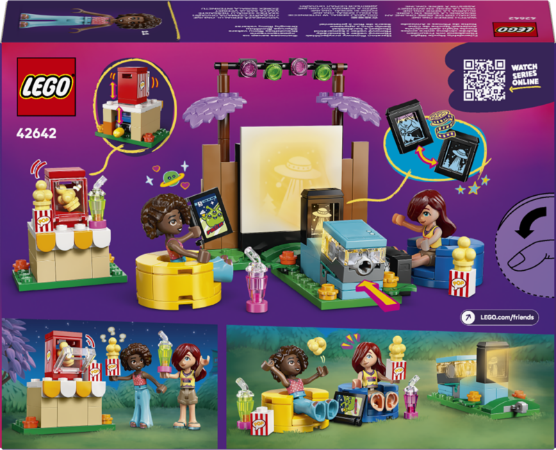 See põnev ehituskomplekt lastele on täis filmiõhtu maagiat! 6-aastased ja vanemad tüdrukud, poisid ja filmifännid saavad luua oma kassahitte LEGO® Friends Sõpruse filmiõhtu (42642) matkimismänguga.