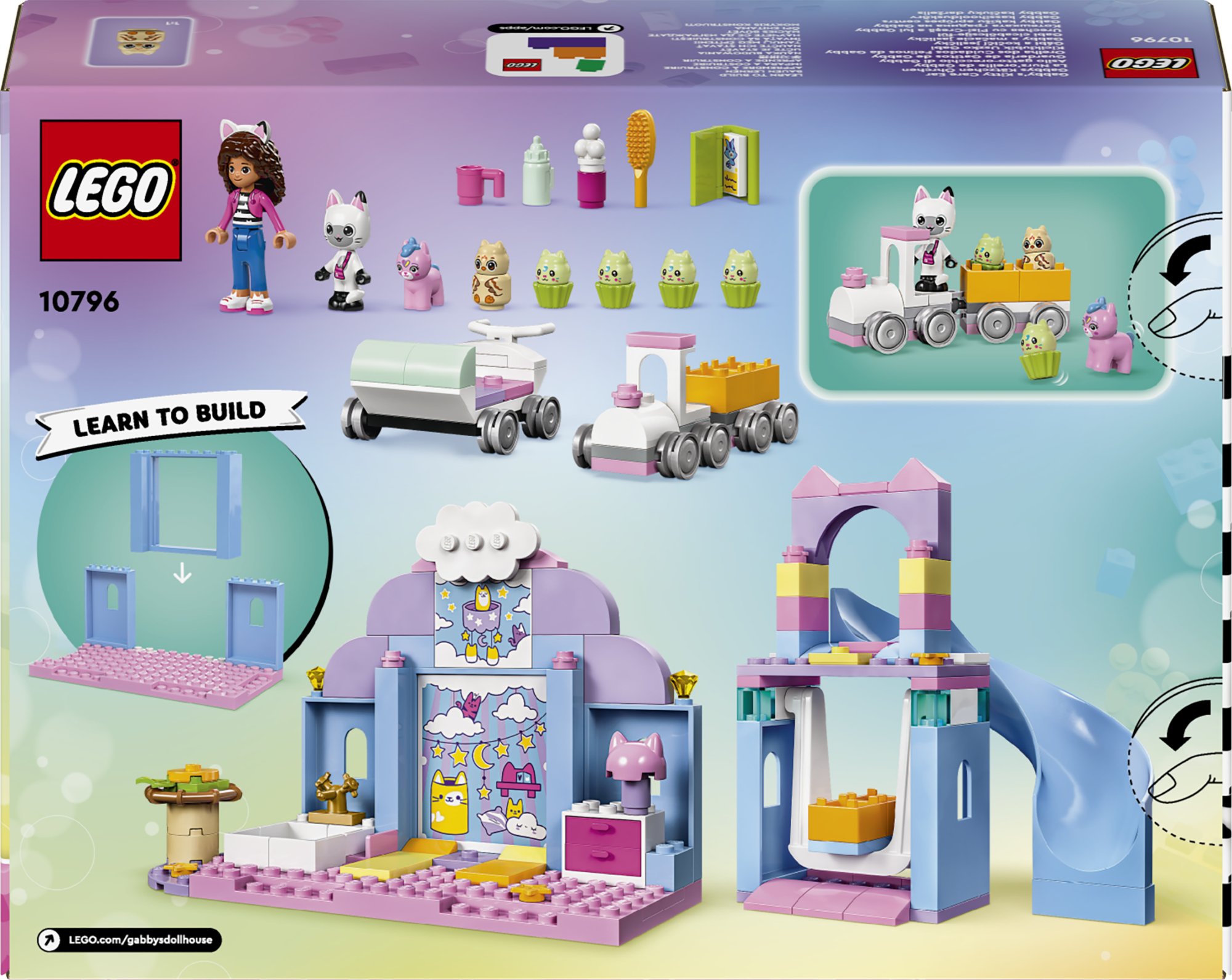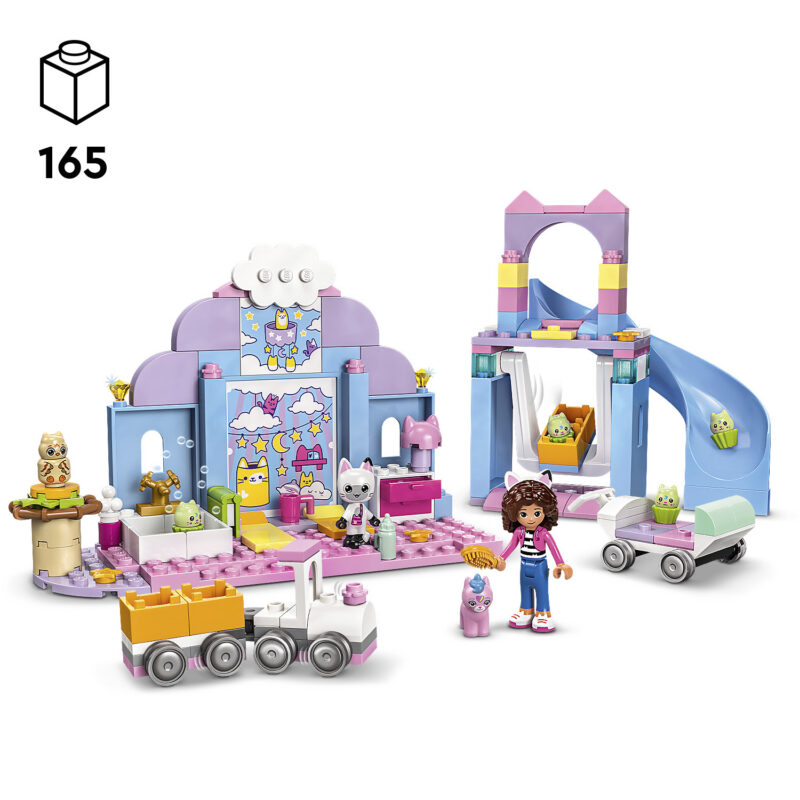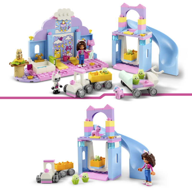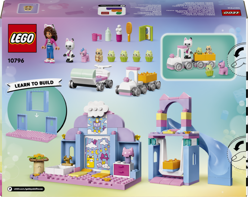 • LEGO® loomafiguurid – sisaldab Gabby mininukku ning Pandy Pawsi, Baby Kittycorni, Baby Me-Owli ja nelja Baby Cupcake’i figuuri, lisaks suurt põhiklotsi, et ehitamine ja mängimine saaks kiirelt alata