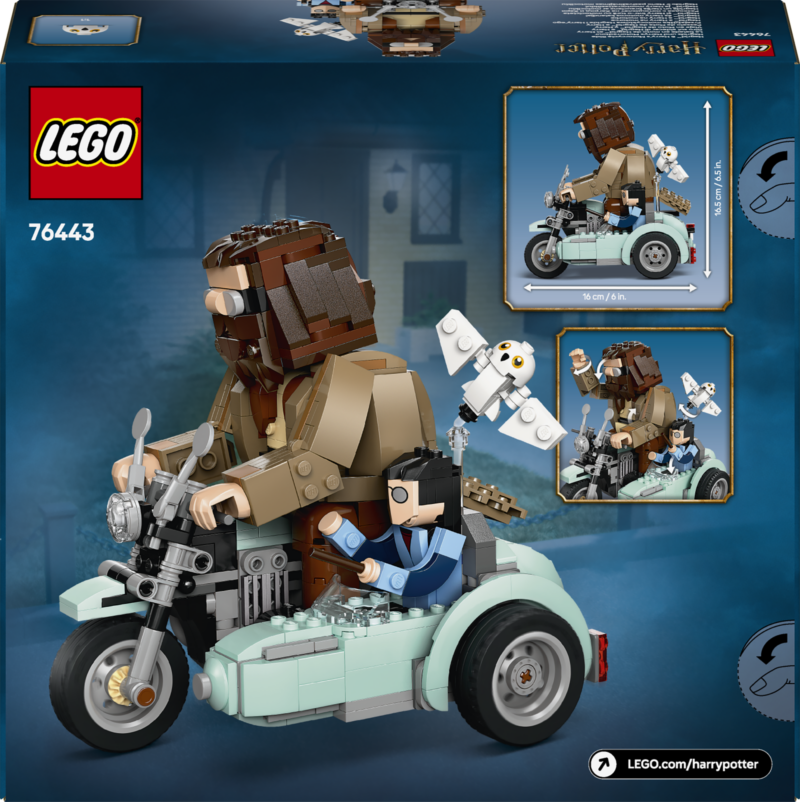 • 3 klotsidest LEGO® Harry Potteri™ tegelaskuju – mudelil on sisseehitatud muudetava asendiga Harry Potteri, Hedwigi™ ja Rubeus Hagridi™ mängufiguurid, kes sõidavad Hagridi lendaval mootorrattal ja külgkorvil