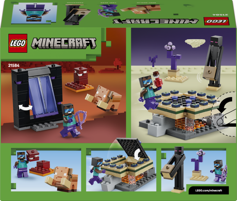 3 tegelaskuju, 2 portaali – aktiveeri mänguportaalid ja astu neist läbi, et leida mõlemast bioomist LEGO® mudel ja Minecraft® tegevus laheda kangelase minifiguuriga, lisaks Endermani ja hoglinibeebi figuurid