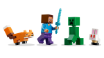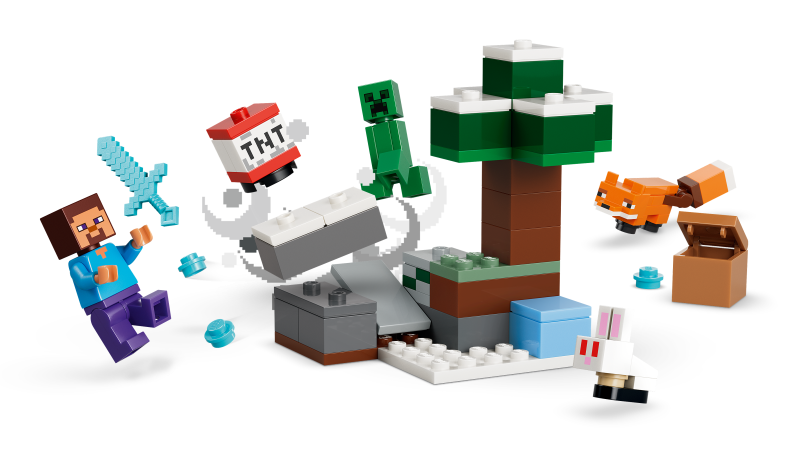 4 LEGO® Minecraft® tegelast – ehita seiklusi taigabioomis koos Steve’i minifiguuriga, lisaks Creeper ja kaks Minecrafti loomafiguuri, rebane ja jänkupoeg
