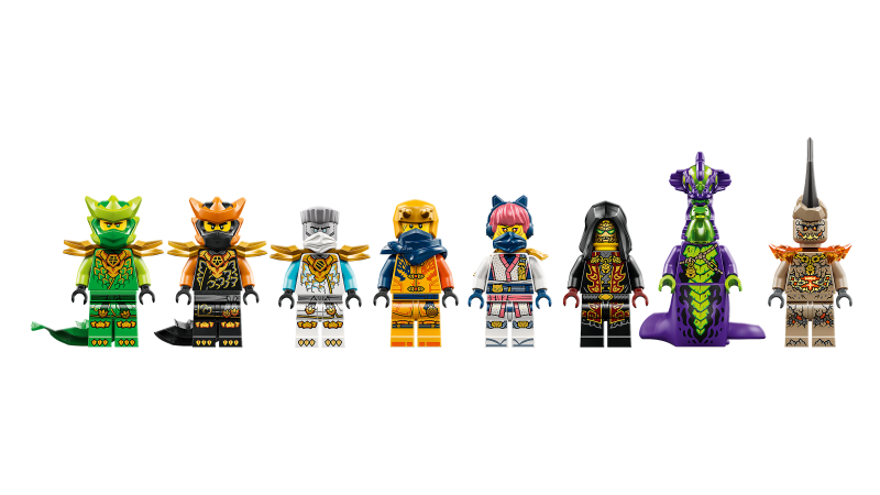 8 NINJAGO® minifiguuri – Laste seiklusmänguasjaga on kaasas Zane, Sora, Arin, draakoni kujul Lloyd, draakoni kujul Cole, Happekoletis, Maakoletis ja Lojalistide juht põnevaks loovmänguks