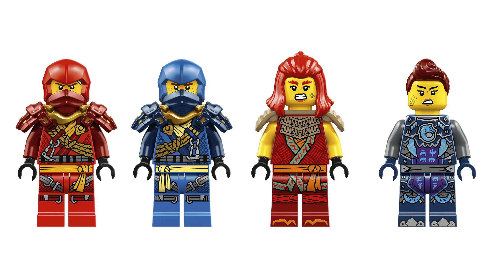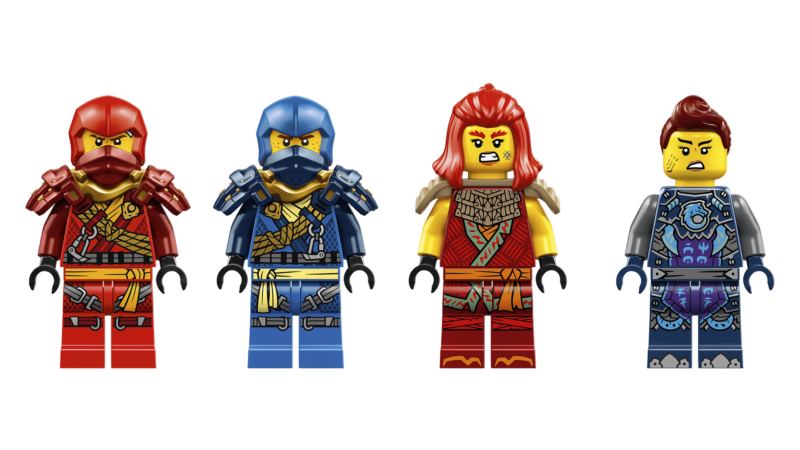 • 4 NINJAGO® minifiguuri: Ronija Kai ja Ronija Jay, mõlemal katana mõõk, Wyldfyre kahe leegitseva rusikaga ja Jordana purilennukiga