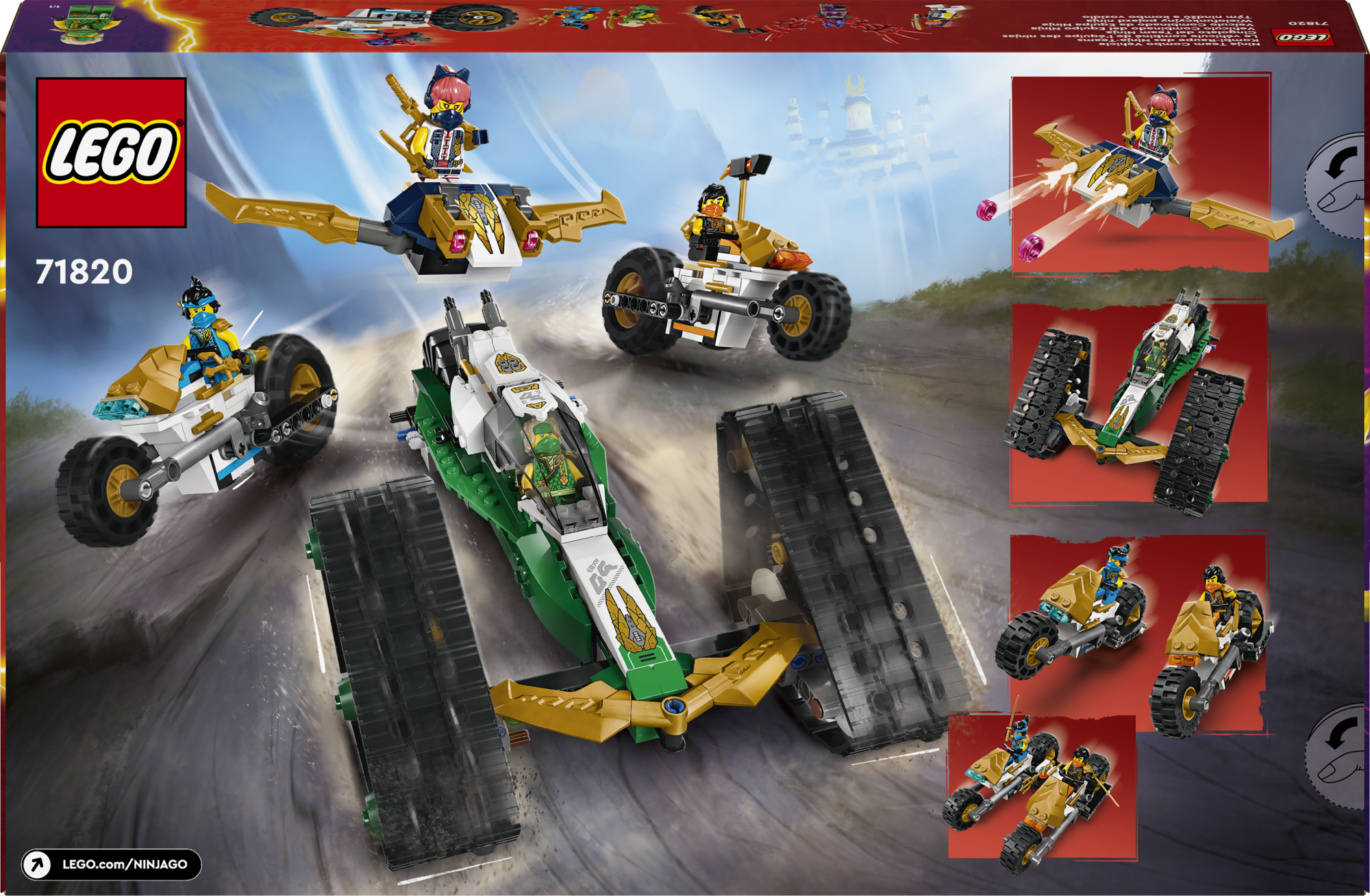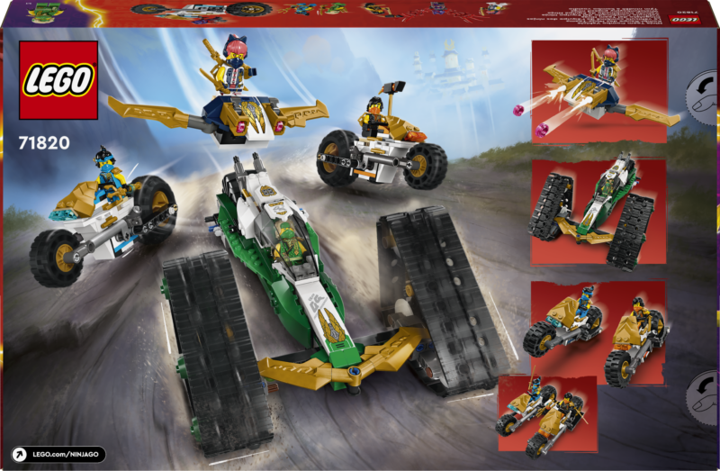 Poisid ja tüdrukud saavad selle Ninjameeskonna kombosõiduki neli-ühes seiklusmänguasjaga (71820) nautida põnevaid seiklusi telesarja NINJAGO Dragons Rising 2. hooajast