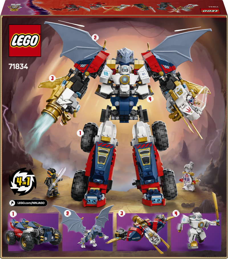 • Neli ühes robotimänguasi lastele – 9-aastased ja vanemad poisid ja tüdrukud saavad taasluua tegevusi sarja NINJAGO® Dragons Rising 3. hooajast selle Zane’i Ultra robotikomplektiga