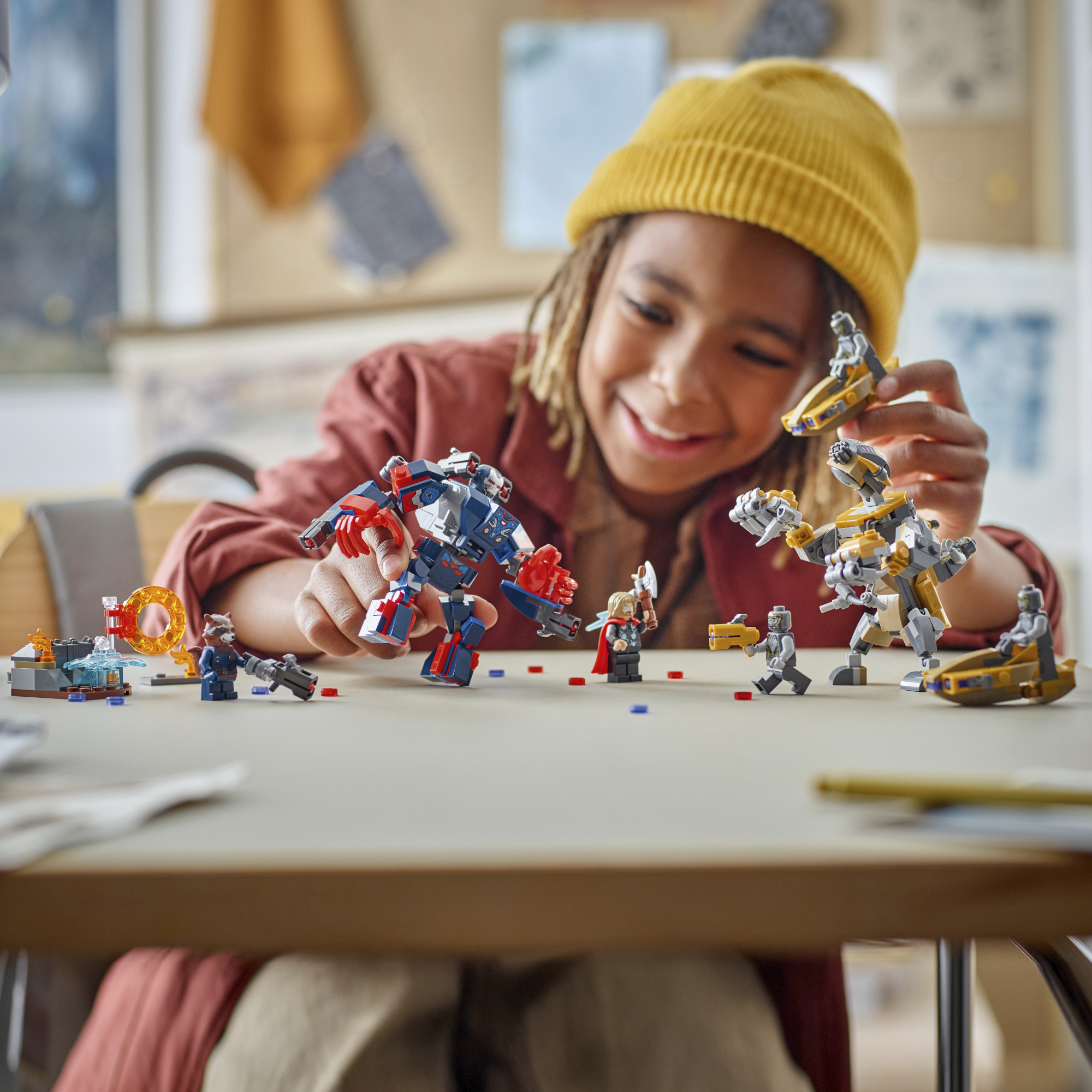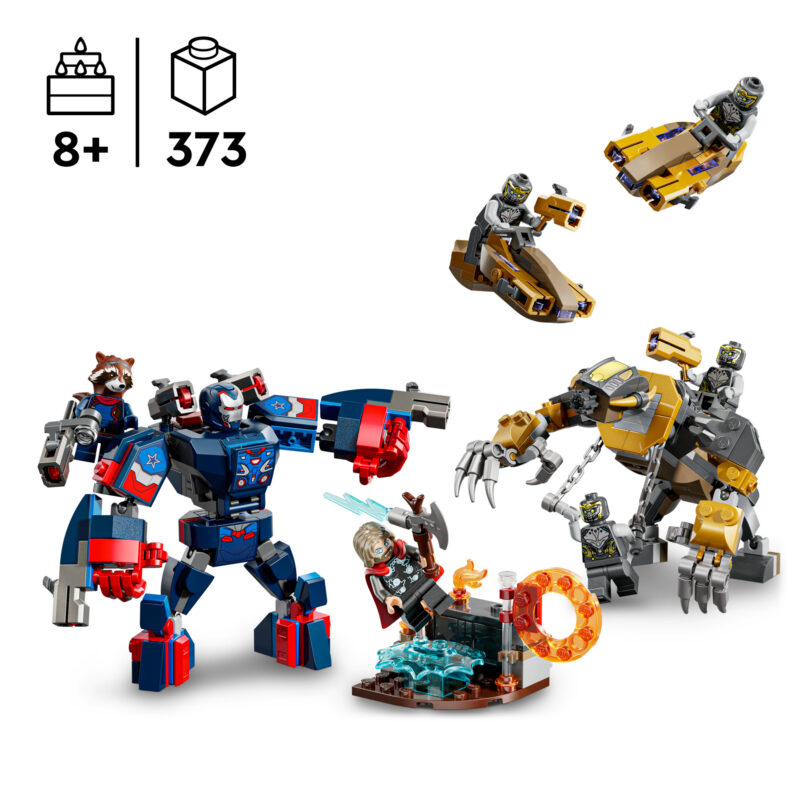 • LEGO® ǀ Marvel minifiguurid – seal on 7 minifiguuri: Iron Patriot MK2; suure nupsukahuriga Rocket; Thor koos Stormbreakeriga; ja 4 Chitaurit, millest kahel on kuldsed nupsukahurid