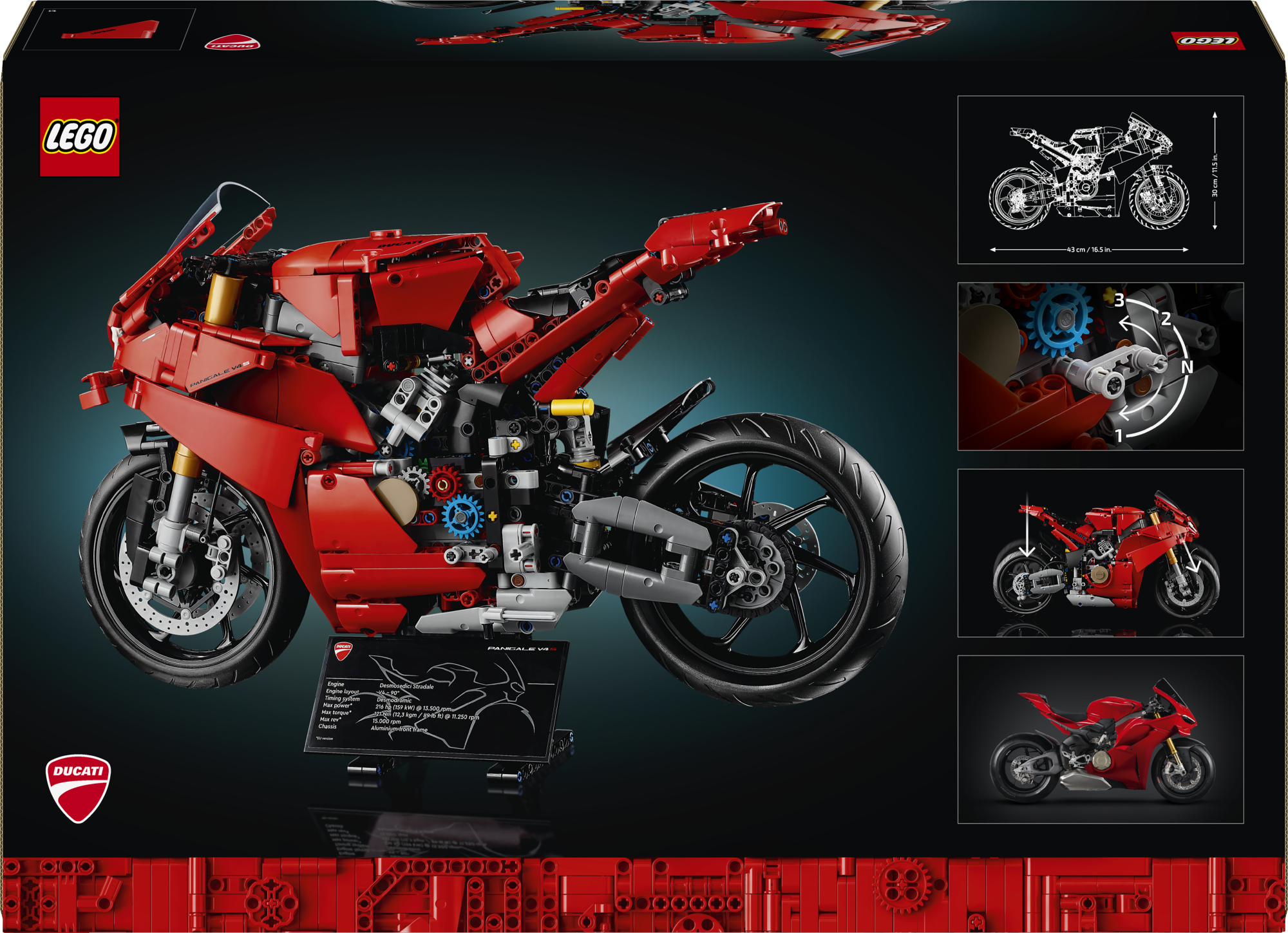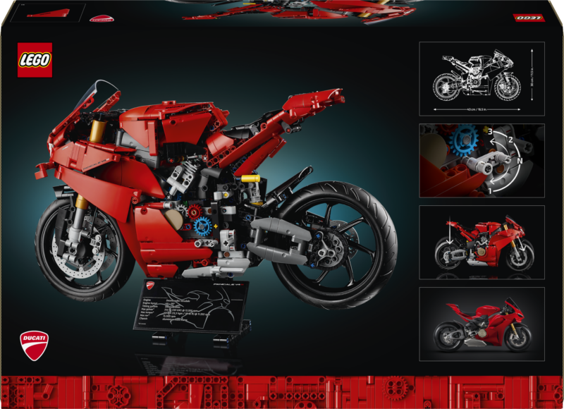 • LEGO® Technic Ducati Panigale V4 S Motorcycle – Themodel is packed with impressive details and authentic features like the front and rear suspension and steering