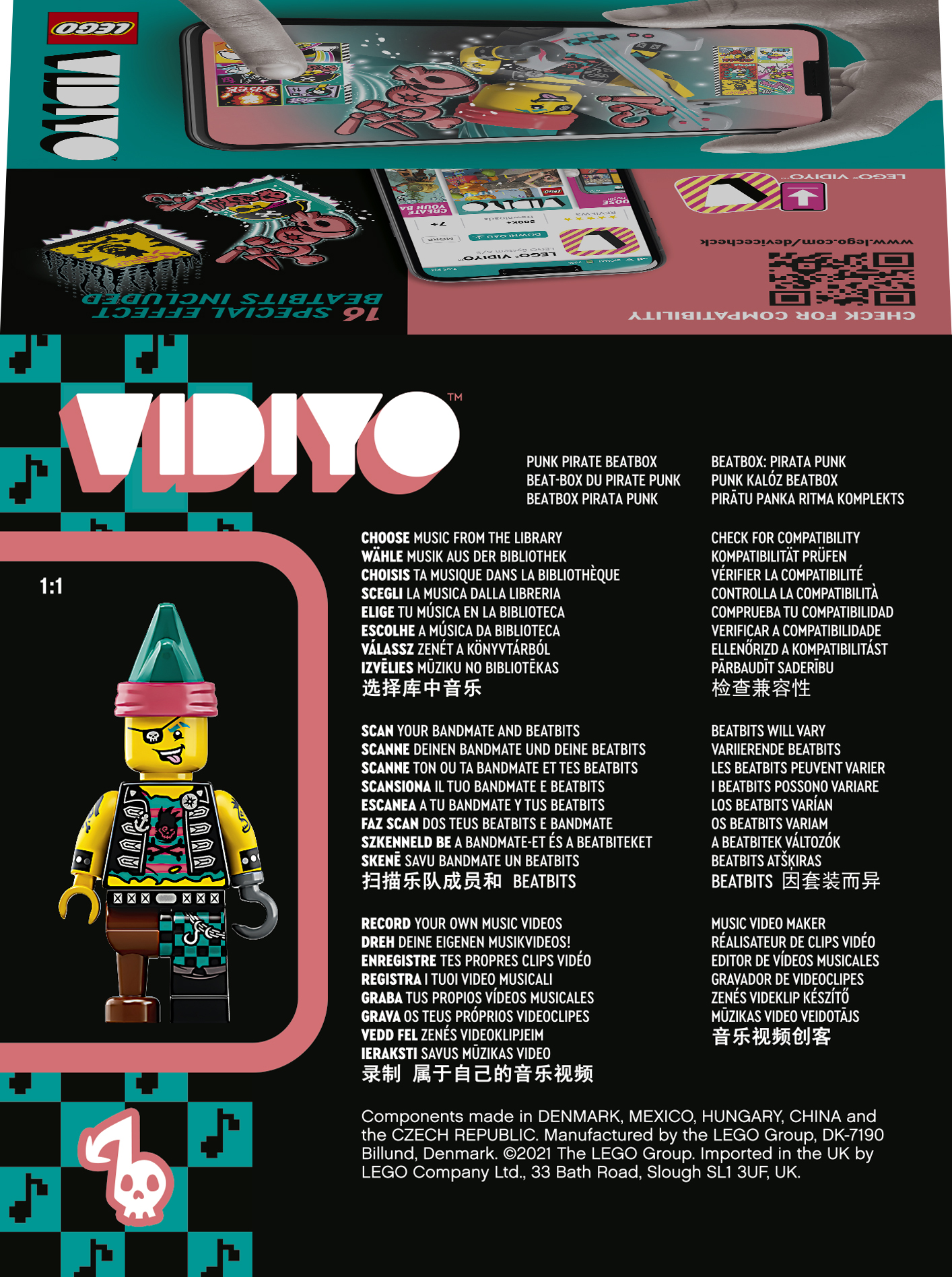 • Innusta lapsi lavastama oma muusikavideoid ja nendes peaosa mängima LEGO® VIDIYO™ Punk Pirate BeatBoxi (43103) abil. Komplektis on punkpiraadi minifiguur kitarriga, 14 juhuslikku BeatBiti ja kaks erilist BeatBiti. • Laadi alla tasuta rakendus LEGO® VIDIYO™, et skannida minifiguuri ja eriefektidega BeatBite. Lastel on põnev vaadata, kuidas nende tegelane ärkab punkstiilist inspireeritud muusikavideos ellu. • Skanni rakenduses BeatBite, et avada eriefekte, nt lahe efekt, mis asendab sõnad punkpiraadist inspireeritud fraasiga „arrr“. • Vahva muusikalahendus vähemalt 7-aastasele poisile või tüdrukule, kes väärib preemiat. See mängukomplekt on ka suurepärane pühadekingitus lapsele, kes armastab muusikamänguasju, tantsimist ja esinemist. • BeatBox on 8 cm kõrgune, 7 cm pikkune ja 10 cm laiune. • BeatBox käib kokku, et lapsed saaksid oma muusikalise maailma endaga igale poole kaasa võtta. BeatBoxis on ruumi klotsidest ehitatud lava, 16 BeatBiti ja punkpiraadi kitarri jaoks. • LEGO® VIDIYO™ rakendus ühildub valitud iOS-i ja Androidi seadmetega. Teavet ühilduvuse kohta leiad veebilehelt www.LEGO.com/devicecheck. Lapsed peaksid küsima interneti kasutamiseks oma vanematelt luba. • LEGO® VIDIYO™ komplektid pakuvad uut seltskonnamänguelamust, kus poisid ja tüdrukud saavad olla lavastajad, produtsendid ja muusikatähed, lavastades ning jagades oma muusikavideoid. • LEGO® detailid vastavad tööstusharu rangetele nõuetele, et tagada nende stabiilne kvaliteet, ühtesobivus ja kindel ühendatavus alati. Nii on see olnud aastast 1958. • LEGO® osi kukutatakse, kuumutatakse, muljutakse, väänatakse ja analüüsitakse. Nii võid kindel olla, et need vastavad rangetele üleilmsetele ohutusstandarditele.