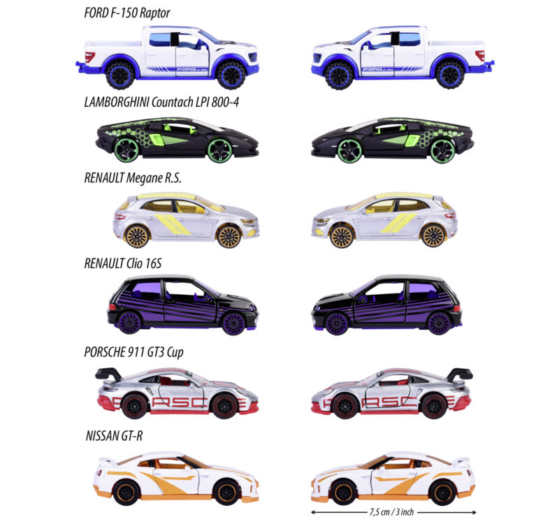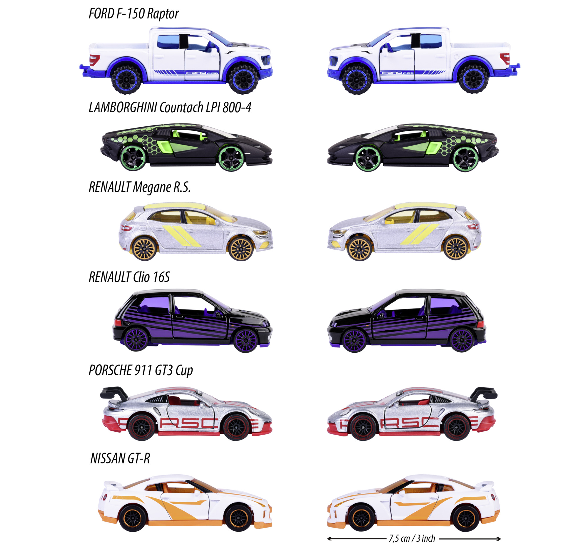 Valikus on kuus eksklusiivset ametlikult litsentseeritud mudelit (Renault, Porsche, Ford, Nissan, Lamborghini), mis on valmistatud detailitäpselt ja vastupidavalt. Erilise lisandväärtuse loovad survevalumeetodil valmistatud autod pöörlevate rataste ja vedrustusega, avatavad detailid koos pilkupüüdva kahevärvilise disainiga ning iga mudeliga kaasas olev kollektsionääri kaart põhiandmetega.