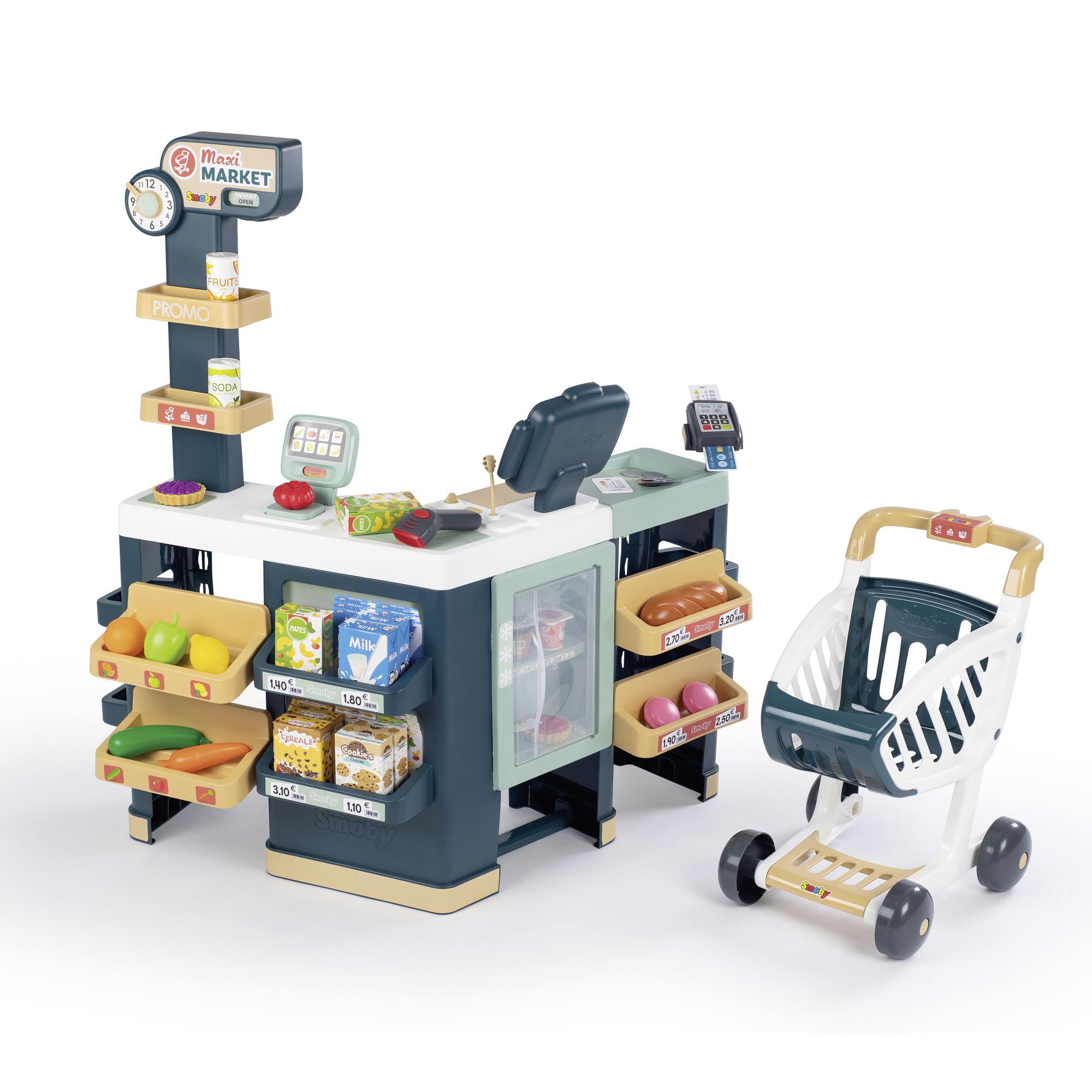Ehita omale vahva müügikoht! Maksimarketil on selleks kaasas erinevad tarvikud: riiulid, karbid, köögiviljad, puuviljad. Siin on isegi külmkapp, kus pakkuda värskeid tooteid nagu jogurtid või tordid. Kaasas on ka reaalselt töötav kaal, mida kasutada köögiviljade kaalumiseks. Toidukaupu saab skännida vöötkoodilugejaga ja seejärel ostu eest tasuda kassas. Kassaaparaadil on rahasahtel, mikrofon ja krediitkaardilugeja.
