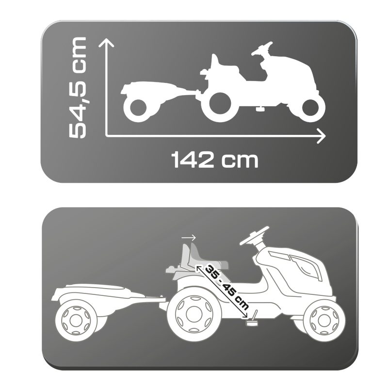 Traktoril on kvaliteetsed pedaalid, reguleeritav kett ja reguleeritav iste. Nüüd pole muud kui traktoriga sõitma! Lisaks on trakroril ka käru, kuhu laps saab panna kõike olulist, et sõita sellega sinna, kuhu vaja.