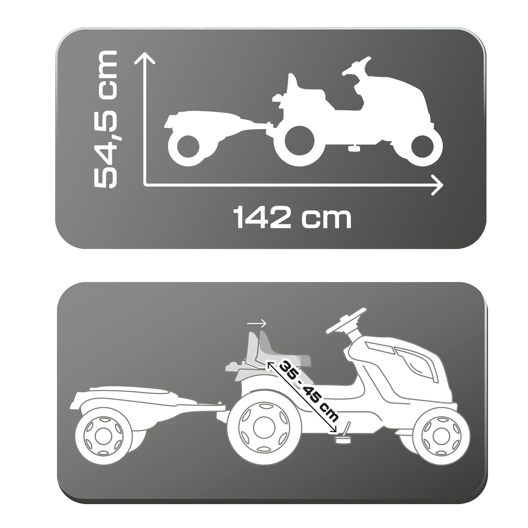 Traktori kõrgus 54,5 cm, pikkus koos järelkäruga 142 cm.