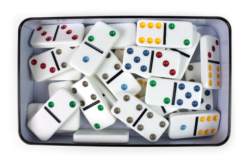 Mängukarbis on 28 doominoklotsi värviliste täppidega.