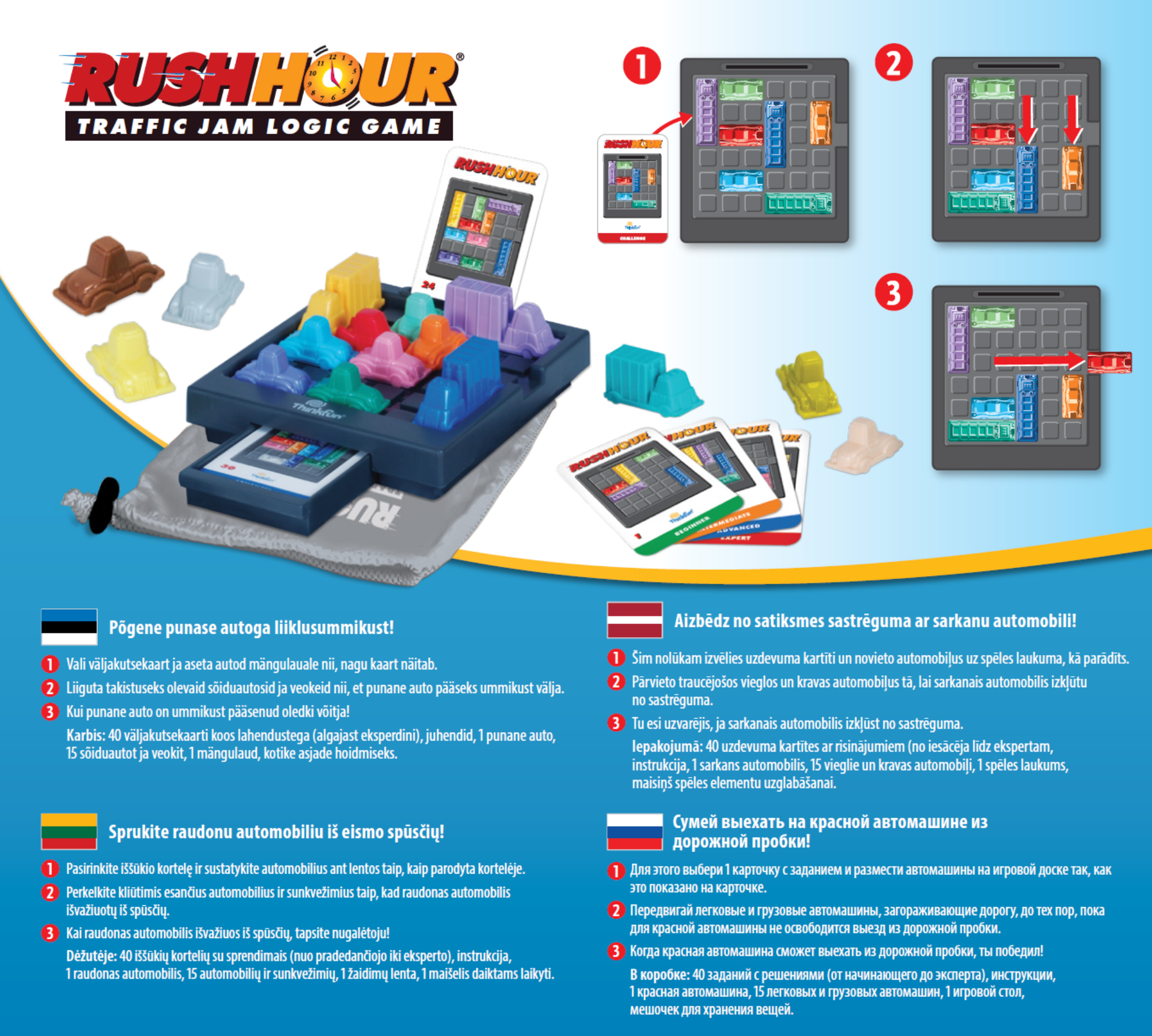 Mängija peab nuputama lahenduse, kuidas punane sportauto liiklusummikust ehk mängulaualt välja pääseb. Suurepärane kaaslane igasse päeva. Kaasavõtmiseks olemas mugav kott.