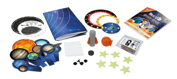Komplektis: vahtplastist rakett, kompass, meteoriidikuuli vorm, pulber meteoriidipalli jaoks, 6 fosforestseeruvat tähte, tähtkujude kaarti, kuukalender, 10 taevakeha, päikesesüsteemi plakat, 2 klambrit, kleepuvad ribad, illustreeritud tegevuste juhend.