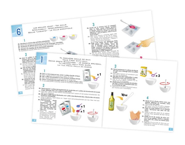Pakend sisaldab: 3 erivärvilist vannipallipulbrit, 1 sidrunhape pakk, 2 pippetti, lusikas, vorm ja illustreeritud juhend. Enne alustamist veendu, et sinu käed ja varustus on täiesti kuivad. Samuti vajad sa oliivõli+ maisitärklist 20g palli kohta, šampooni+teelusikat+kaussi. Erinevate variantide korral vajad veel pudelikorke+tühja pudelit ja klaaskomme.