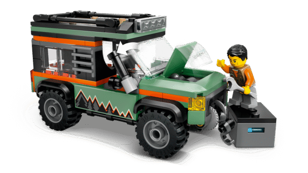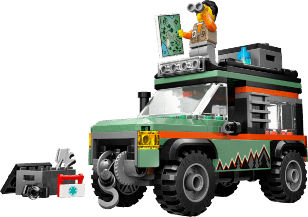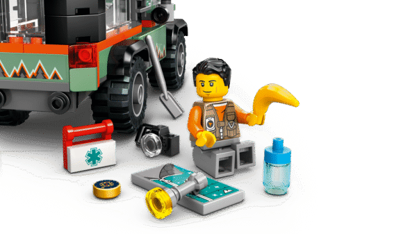 • LEGO® minifiguuride tarvikutega varustatud sõidukikomplekt – komplektis on matkimismängu jaoks mängukaamera, veepudel, taskulamp, kaart, kompass, binokkel, tööriistad ja esmaabikomplekt