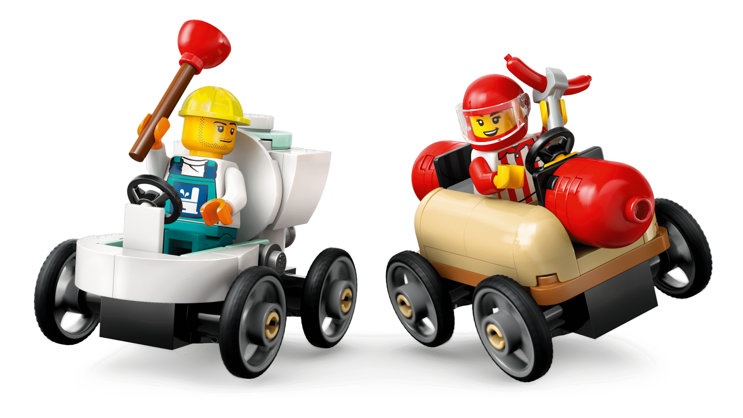 • Mis on karbis? – Kõik, mida lapsed vajavad, et ehitada mänguautodele kaldtee, hot-dogi ja tualeti seebikarbiautod ning neli minifiguuri, sealhulgas hot-dogi müüja ja torumees