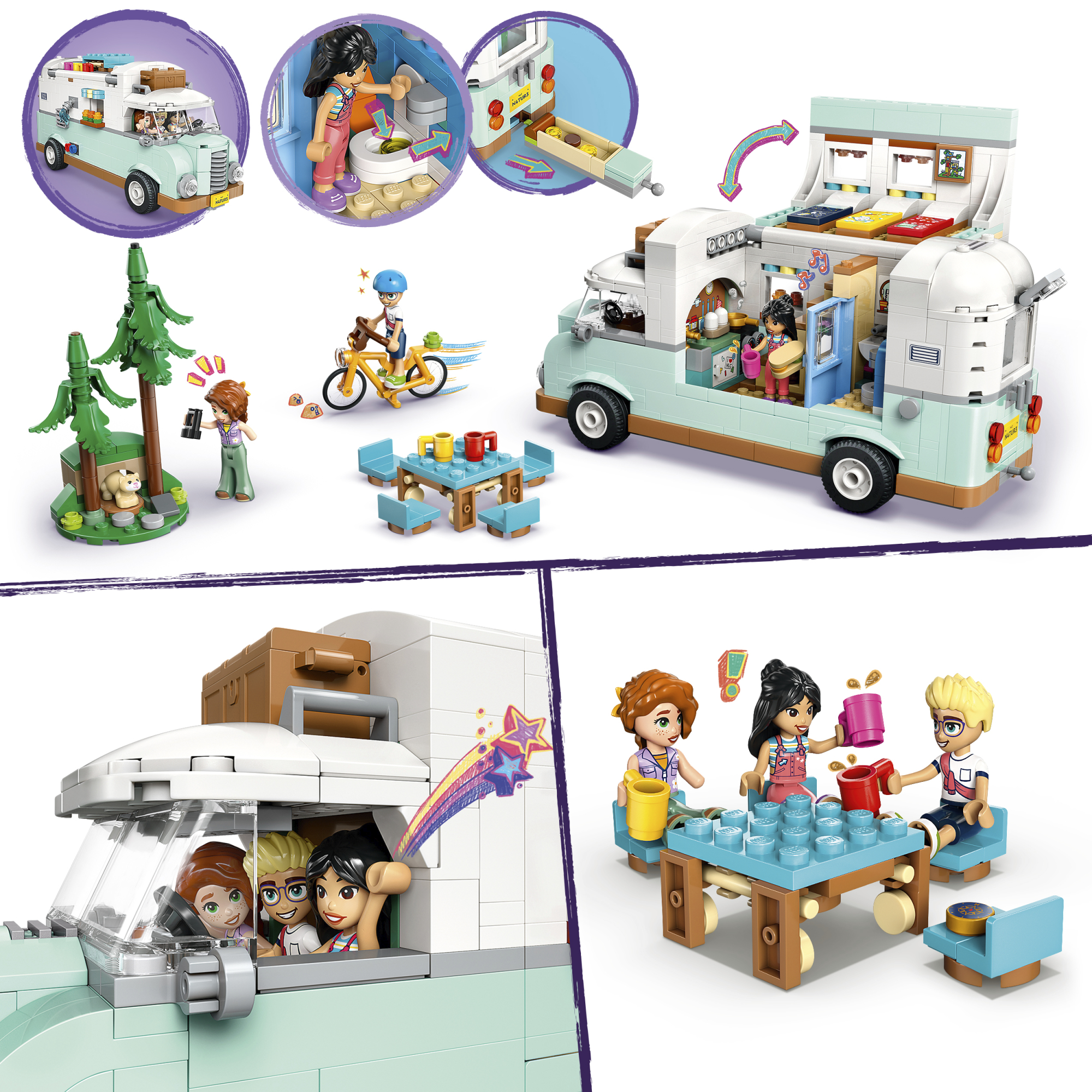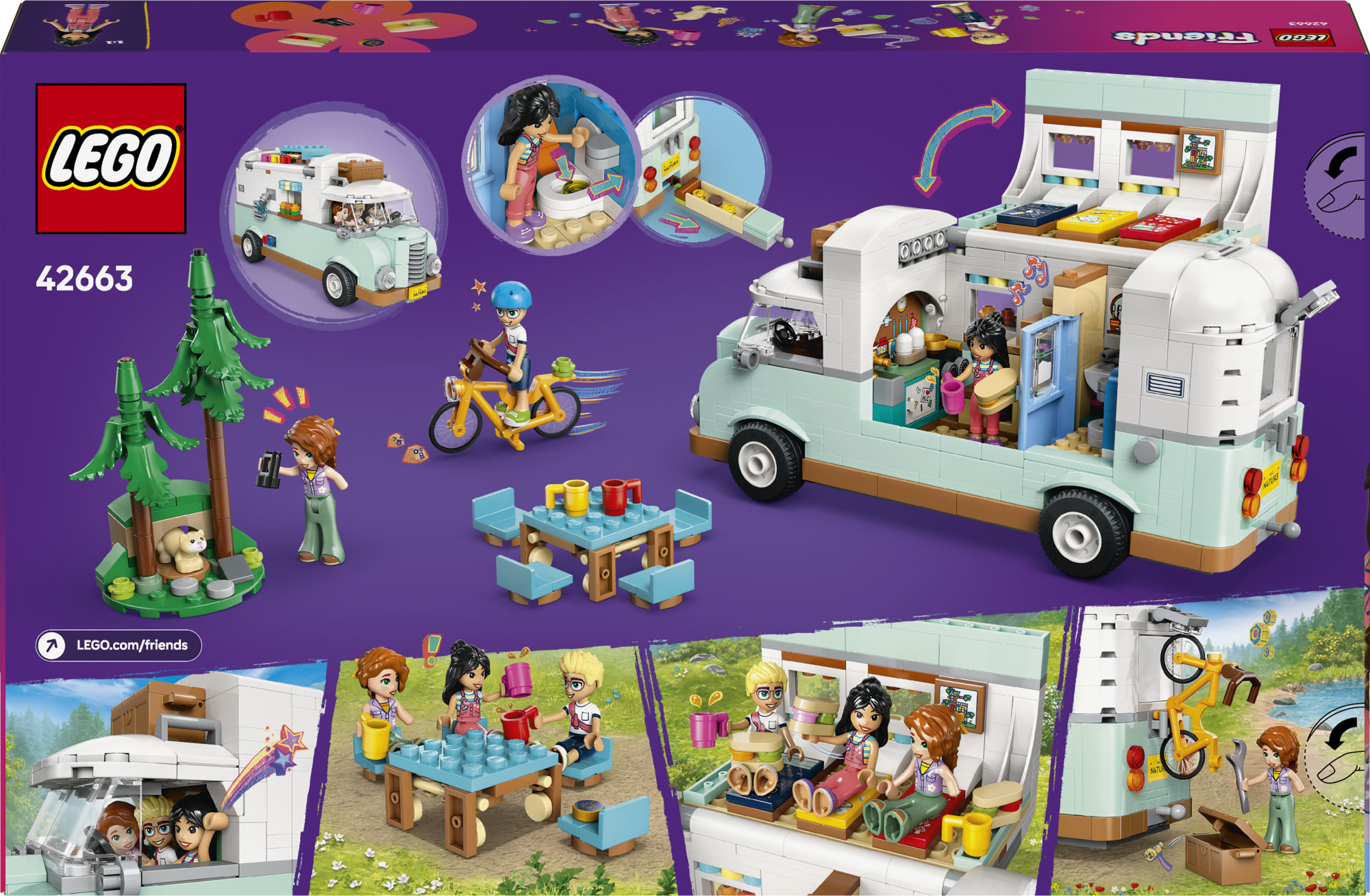 LEGO Friends Sõpruse autosuvila seiklus (42663) sisaldab kokkupandavat LEGO sõidukit, 3 mininukku ja tuhkrufiguuri.